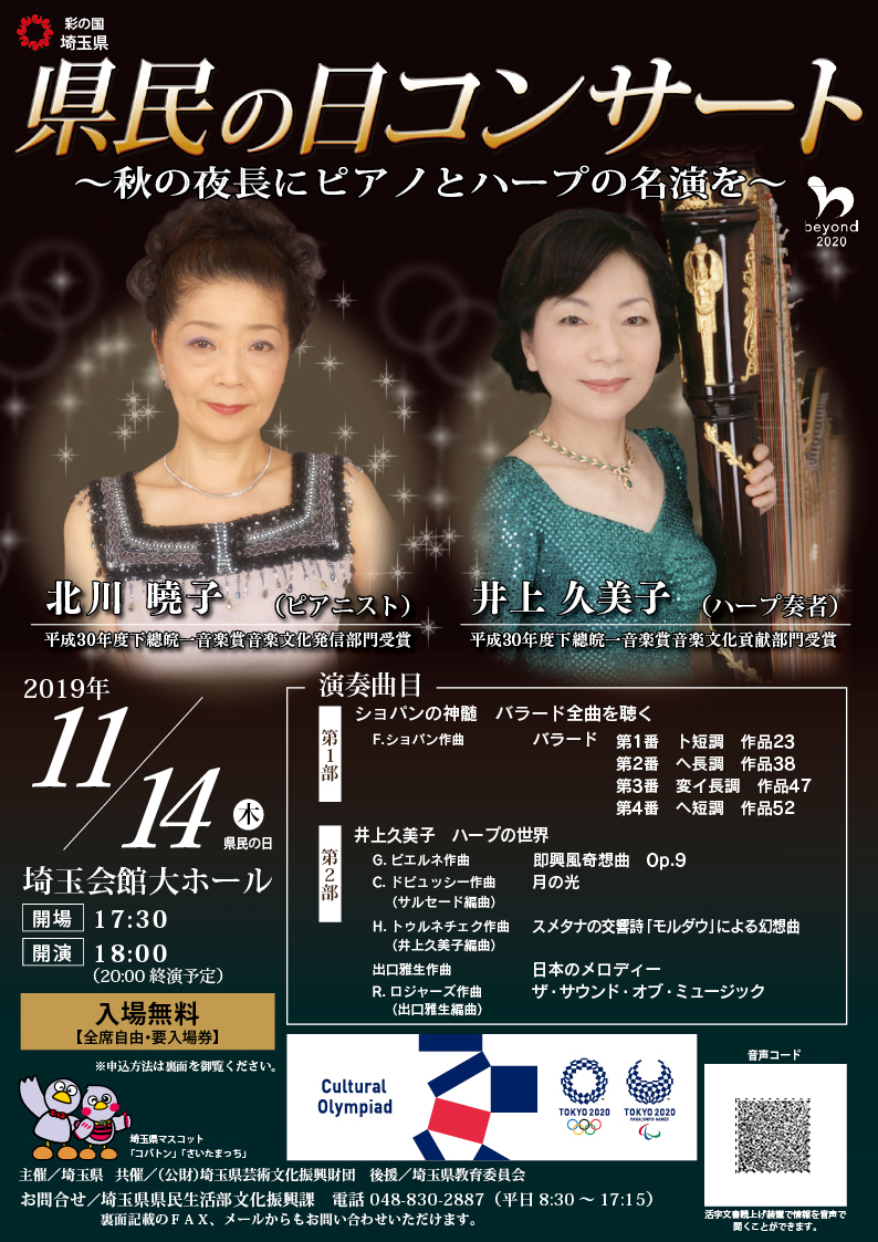 埼玉県では、11月14日(木曜日)の「県民の日」に、平成30年度下總皖ー音楽賞受賞者による「県民の日コンサート-秋の夜長にピアノとハープの名演を-」を開催します。