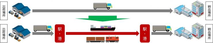 モーダルシフトとは、トラック等の自動車で行われている貨物輸送を環境負荷の小さい鉄道や船舶の利用へと転換することをいいます。