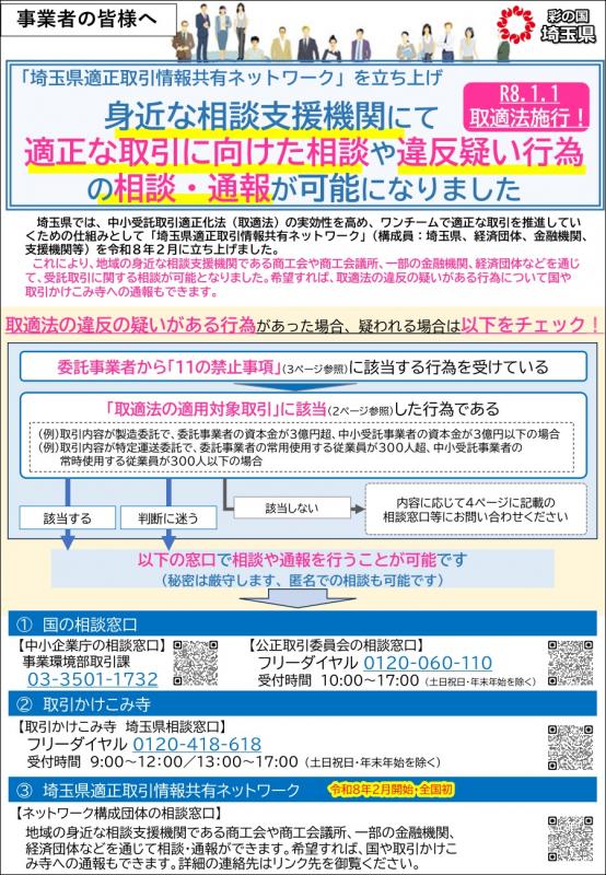 埼玉県では、中小受託取引適正化法(取適法)の実効性を高め、ワンチームで適正な取引を推進していくための仕組みとして「埼玉県適正取引情報共有ネットワーク」(以下「ネットワーク」)を令和8年2月に立ち上げました。