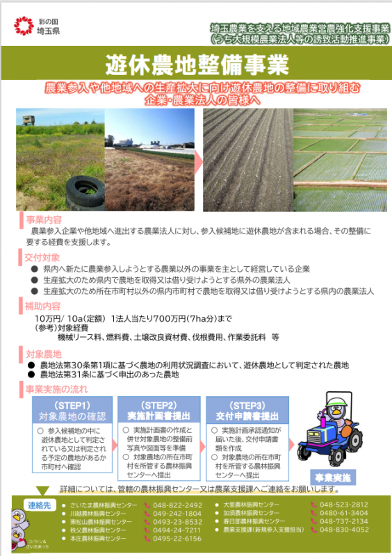 担い手がいない又は将来の担い手確保が見込まれない地域への企業による農業参入や農業法人の進出を促すため、埼玉県の企業参入支援の取組や参入事例を紹介するセミナー及び県内の参入候補地を見学する現地ツアーを開催し、農業参入先としての埼玉県の魅力をPRするとともに、参入候補地に遊休農地が含まれている場合は、その整備に要する経費を支援します。