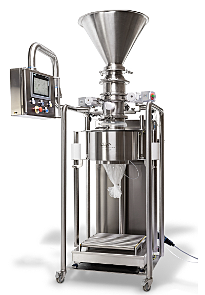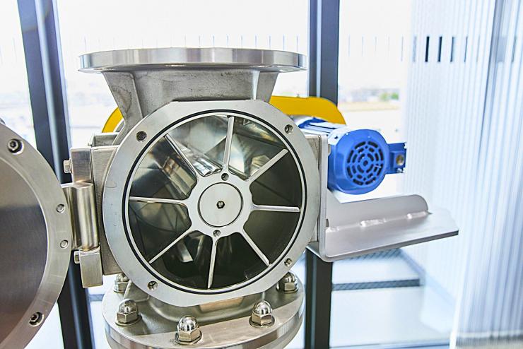 (左から順に)小型吸引空気輸送装置、空気輸送用3方ボールバルブ、精密計量システム(イタリア製)、解砕機・ほぐし機