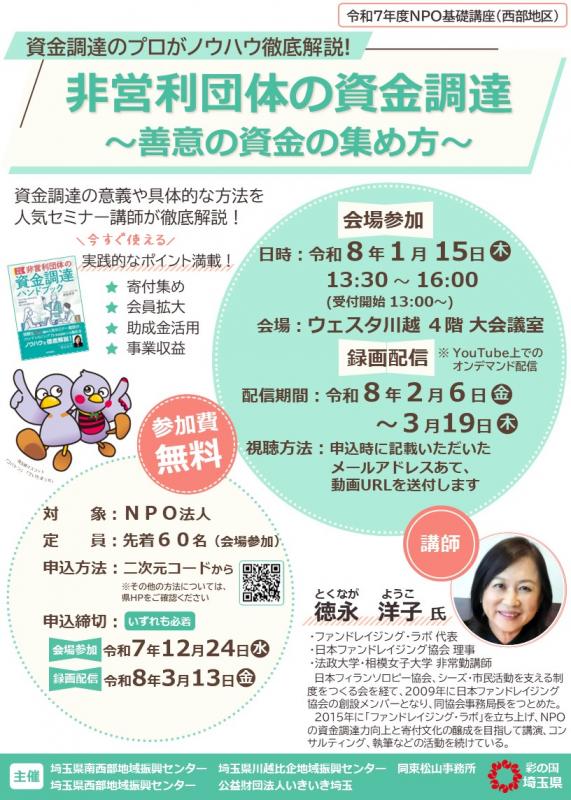 トップページ > 県政情報・統計 > 県概要 > 組織案内 > 企画財政部 > 企画財政部の地域機関 > 南西部地域振興センター > 県民生活 > 令和7年度NPO基礎講座「非営利団体の資金調達~善意の資金の集め方~」を開催しました。