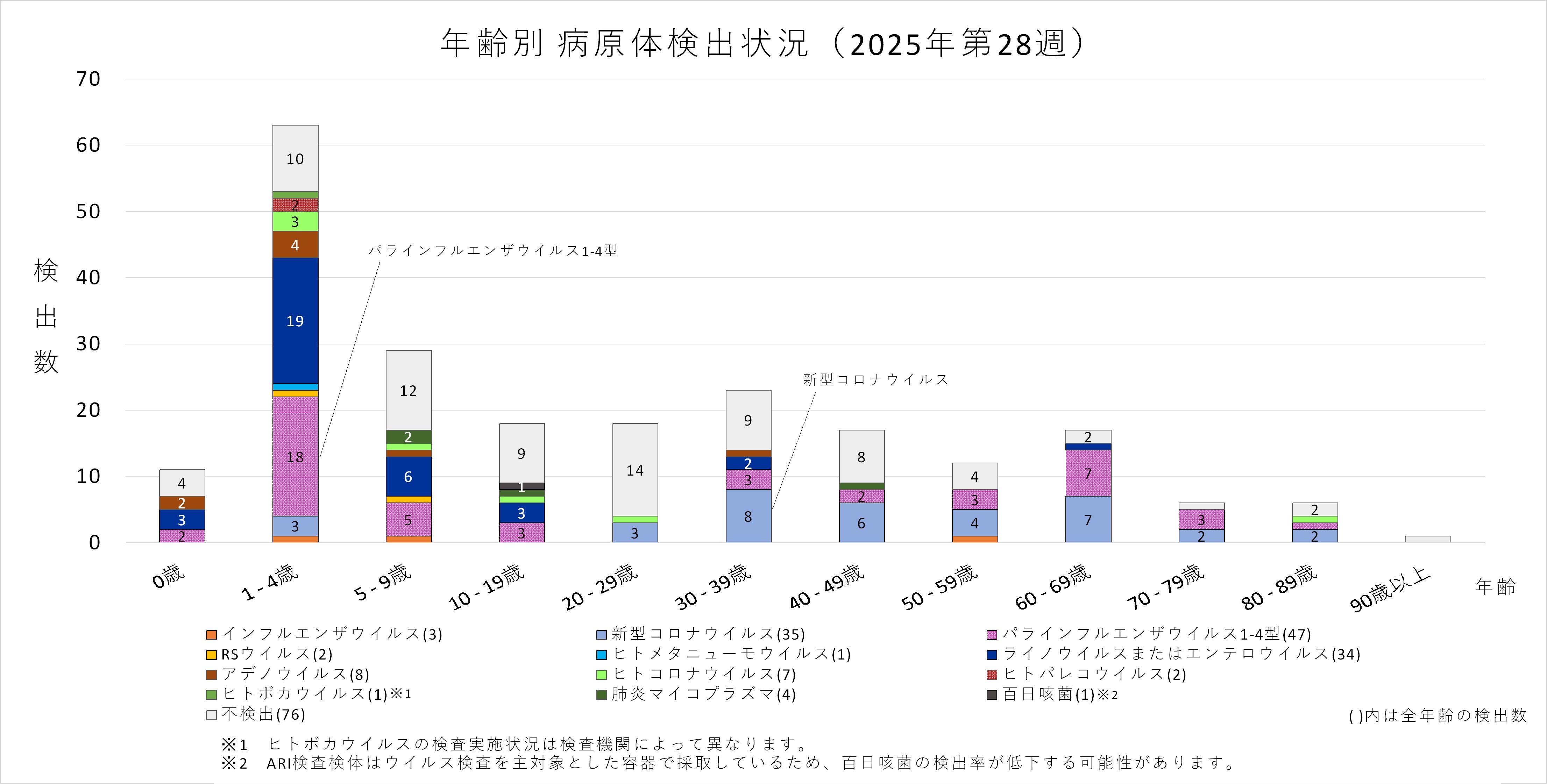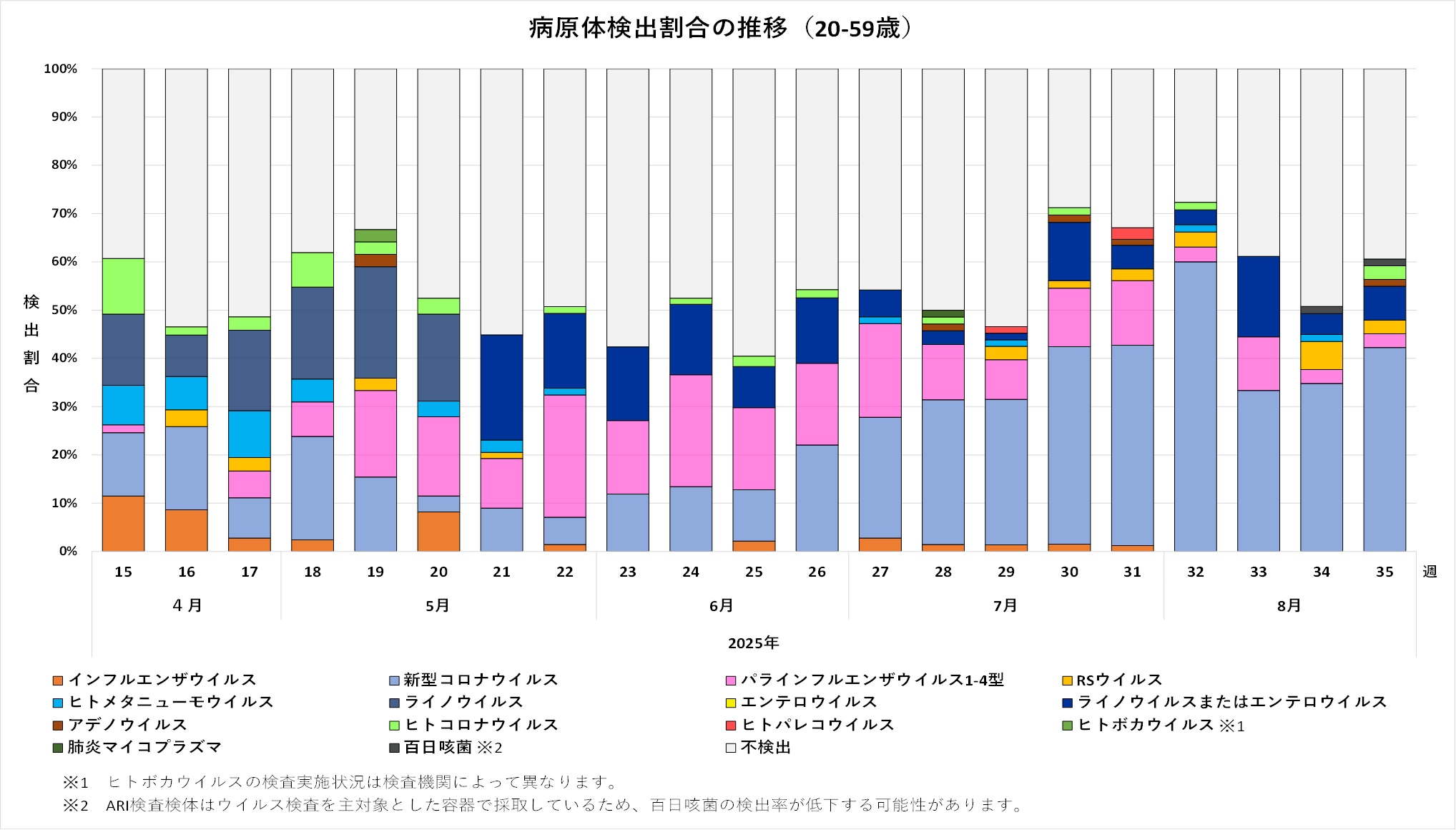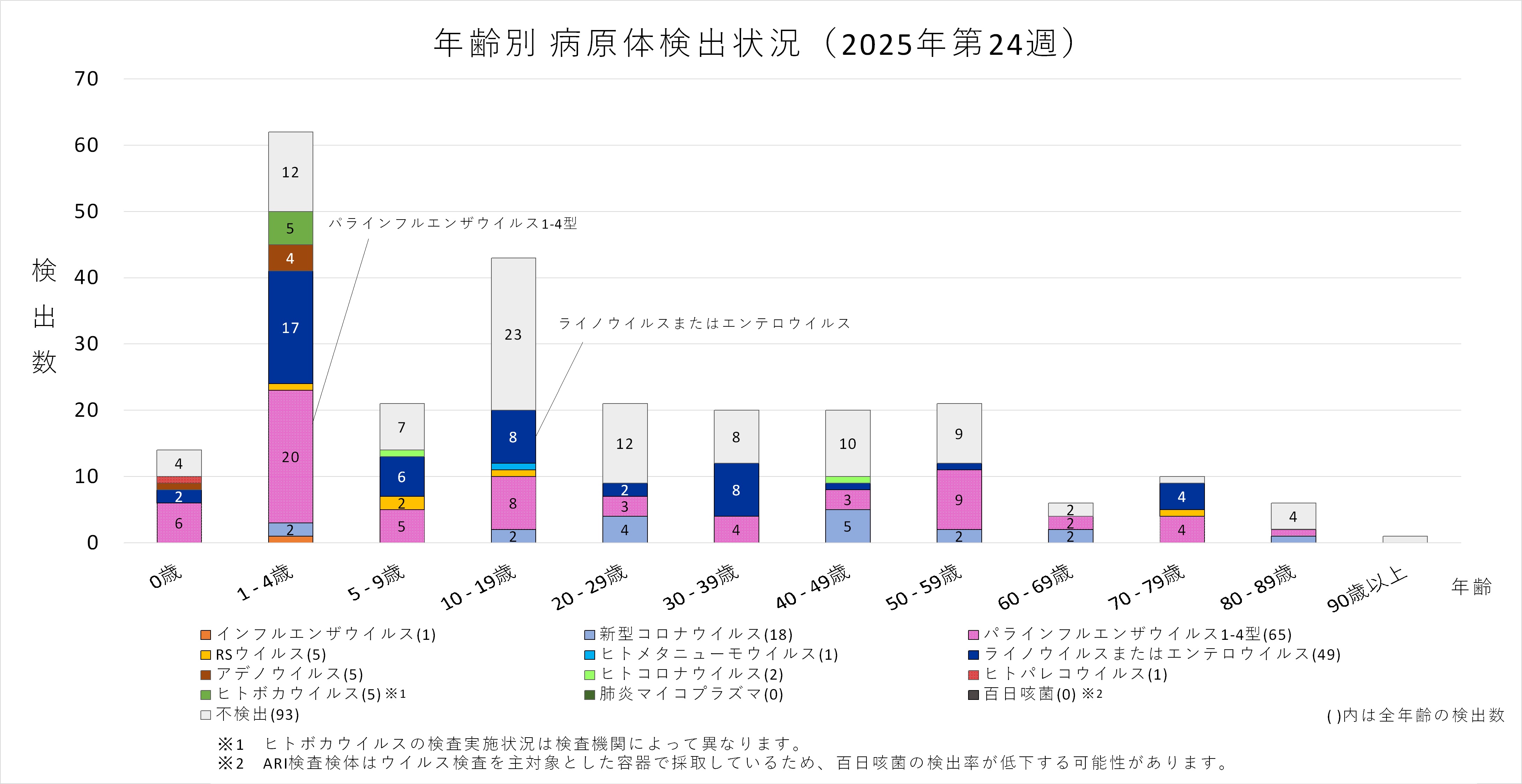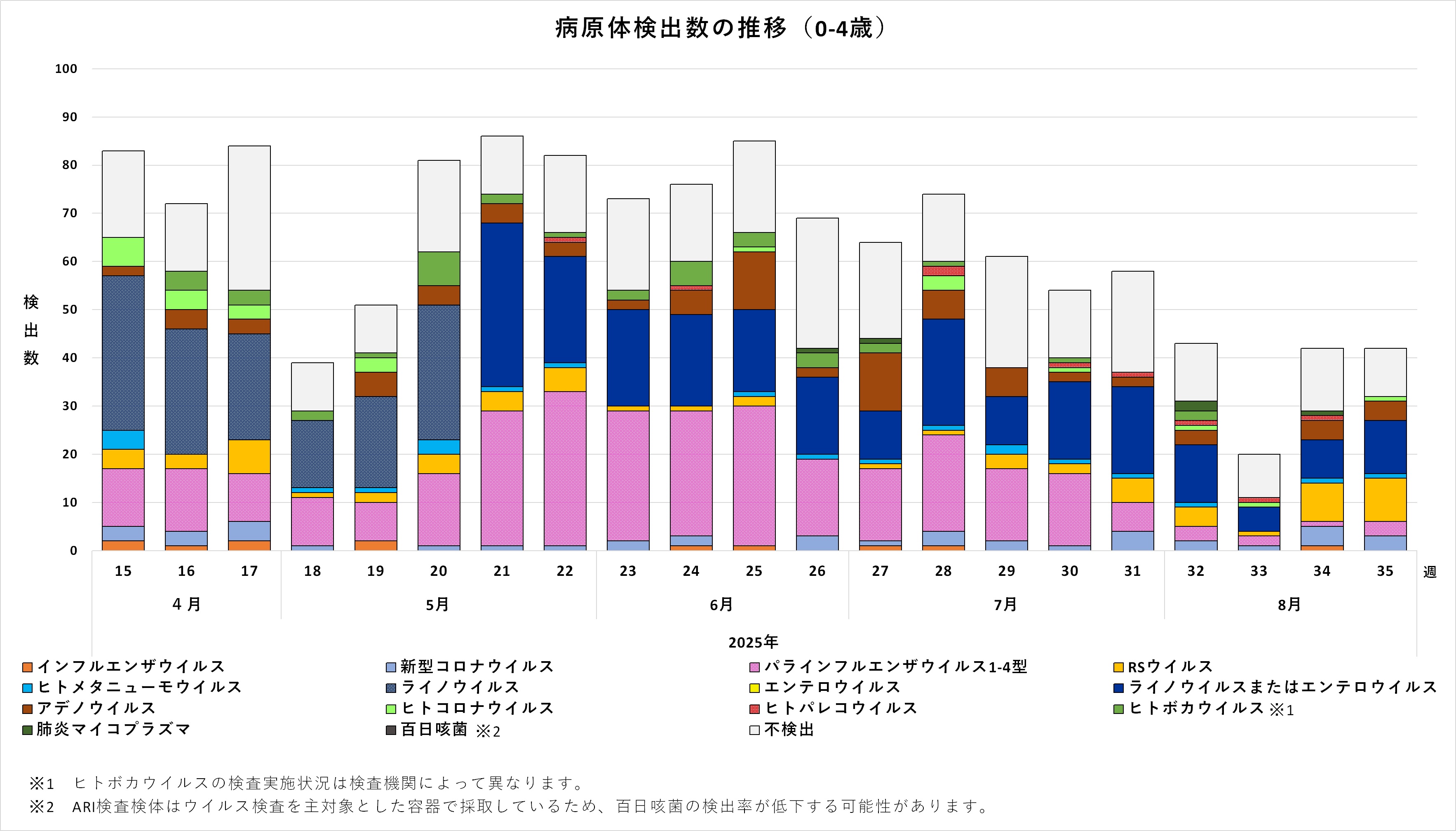 トップページ > 県政情報・統計 > 県概要 > 組織案内 > 保健医療部 > 保健医療部の地域機関 > 衛生研究所 > 感染症情報センター > かぜ様症状の原因ウイルスの流行状況(急性呼吸器感染症(ARI)病原体サーベイランス)