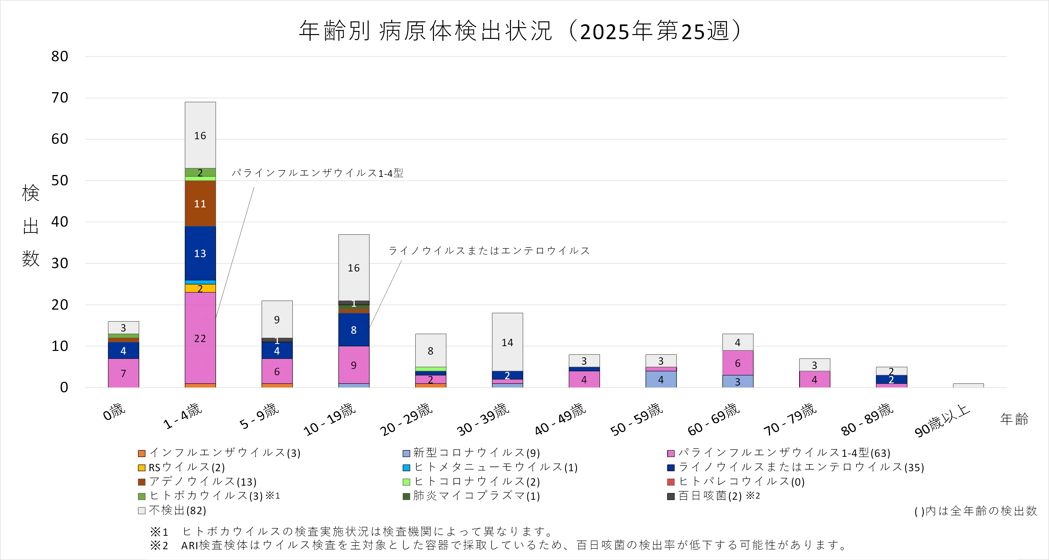 感染症の予防及び感染症の患者に対する医療に関する法律第15条に基づく感染症発生動向調査により、2025年4月7日(第15週)以降、埼玉県内の定点医療機関で採取に御協力いただいた検体について、埼玉県衛生研究所、さいたま市健康科学研究センター、川越市保健所、越谷市保健所及び川口市保健所でおこなった検査結果を集計しています。2025年10月6日時点の集計であるため、今後データが更新される可能性があります。