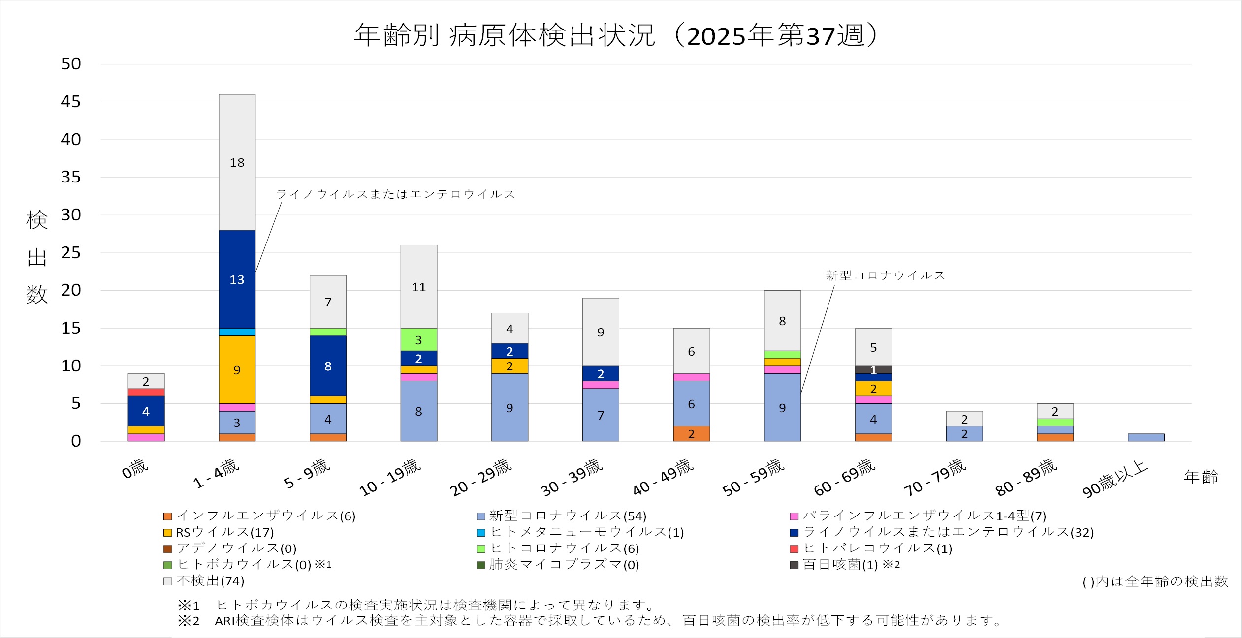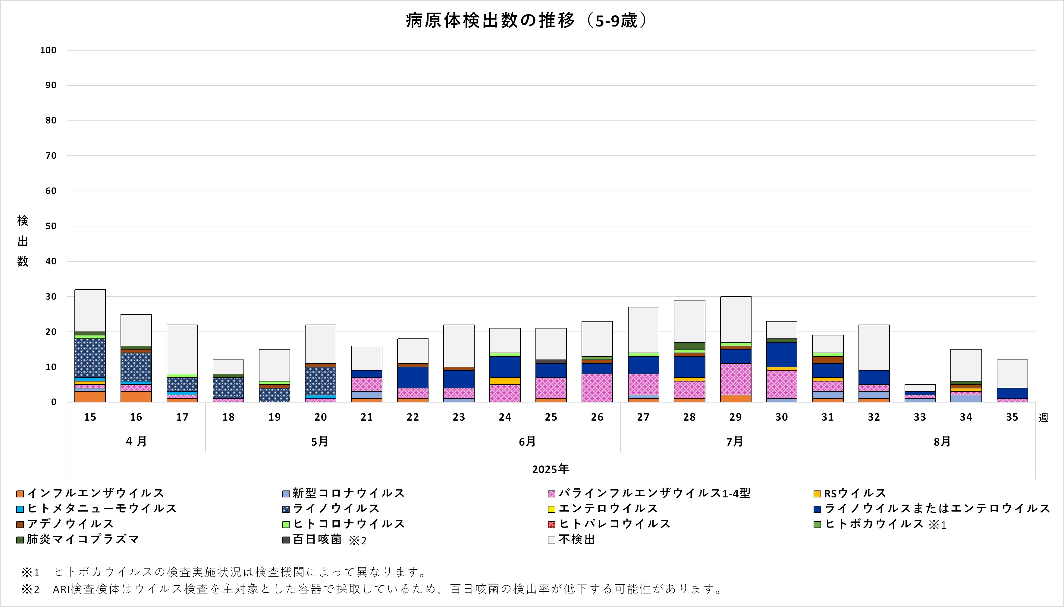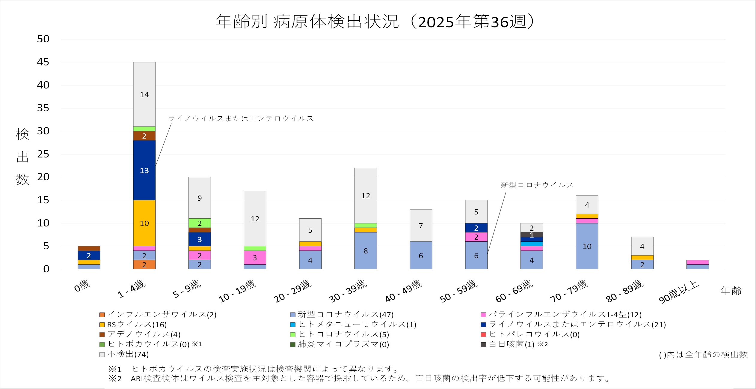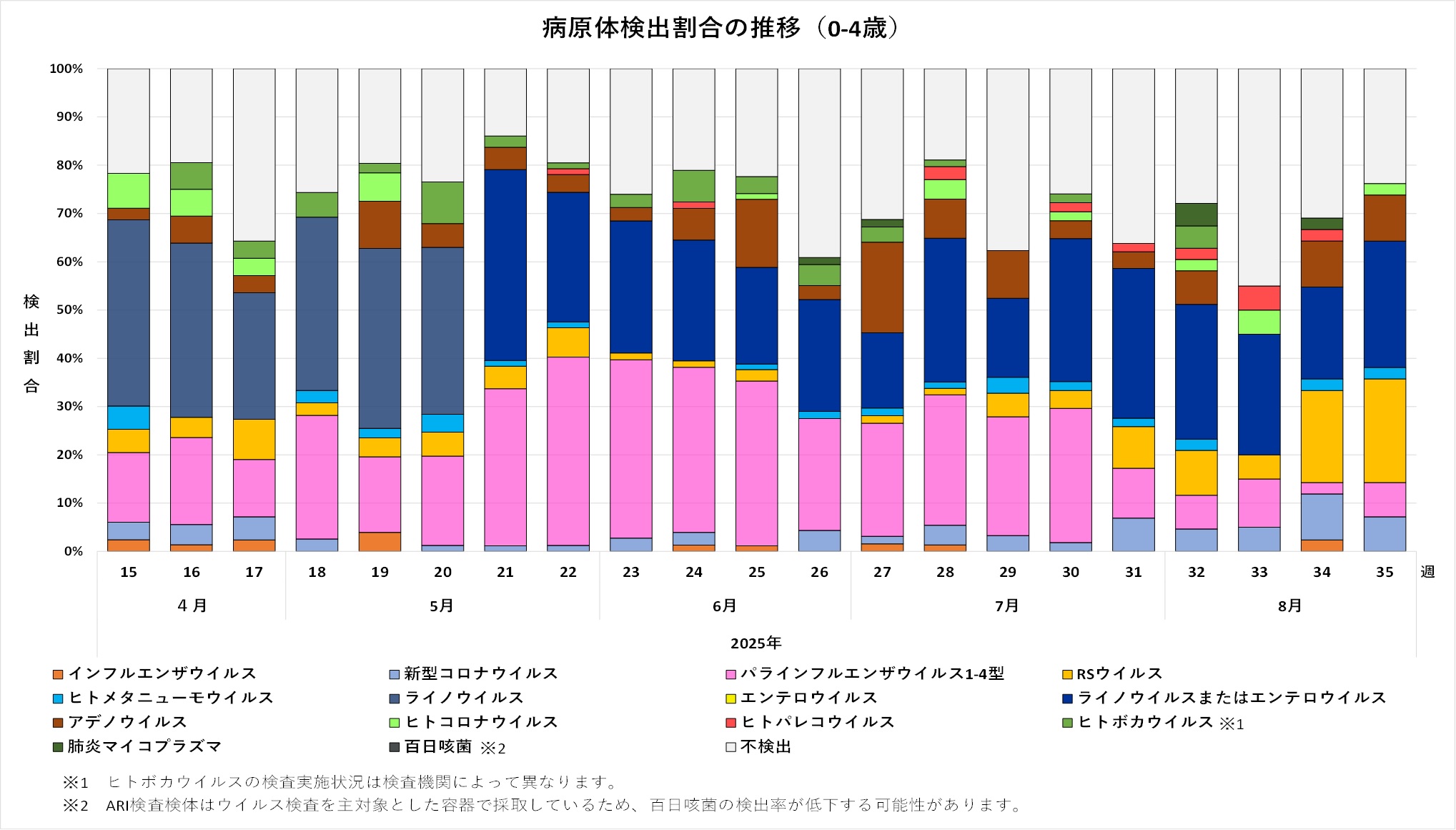 1歳以上5歳未満では引き続きRSウイルス及び「ライノウイルスまたはエンテロウイルス」の検出が目立っています。