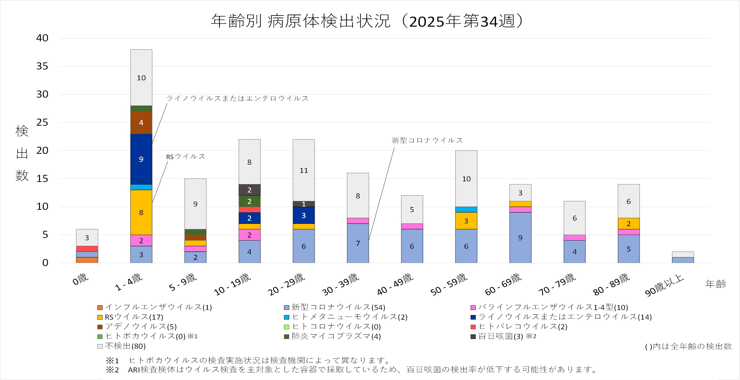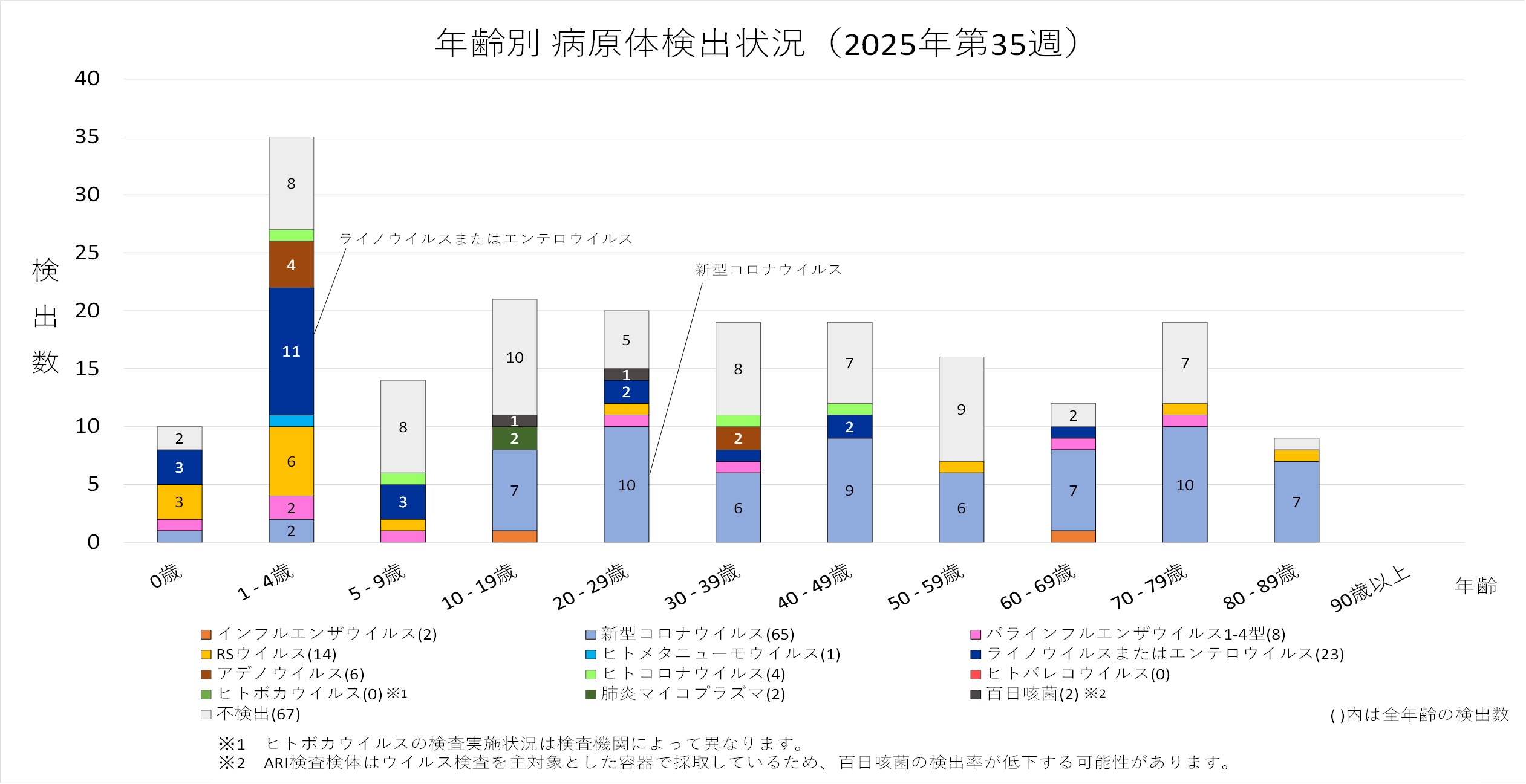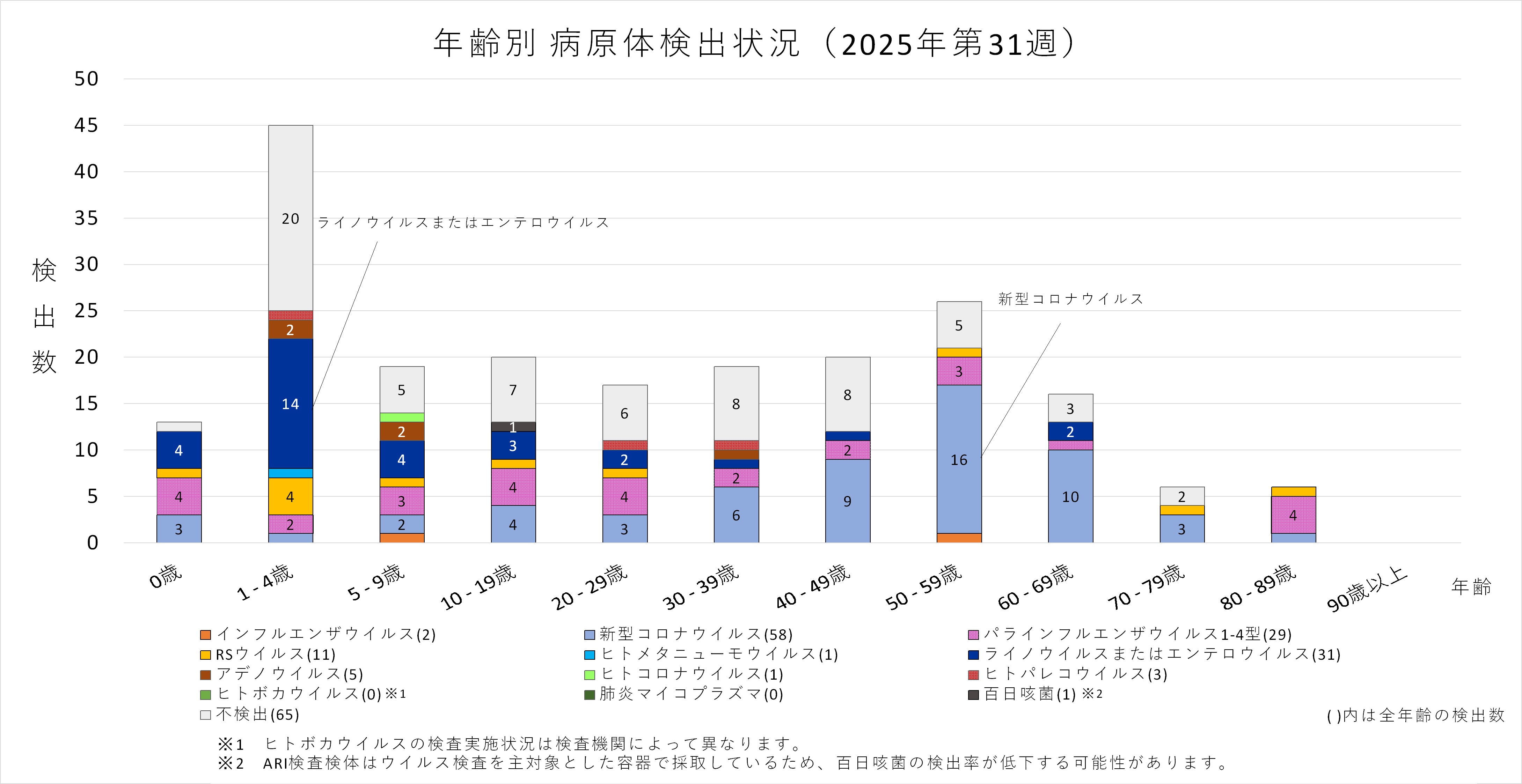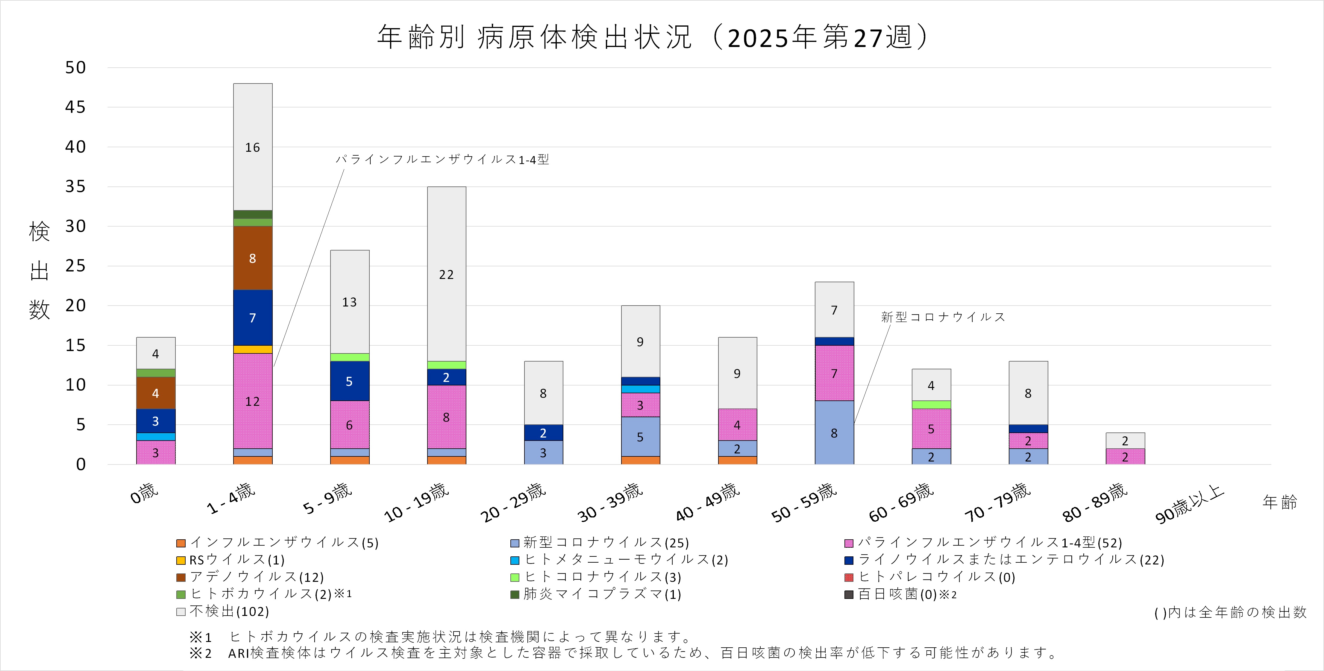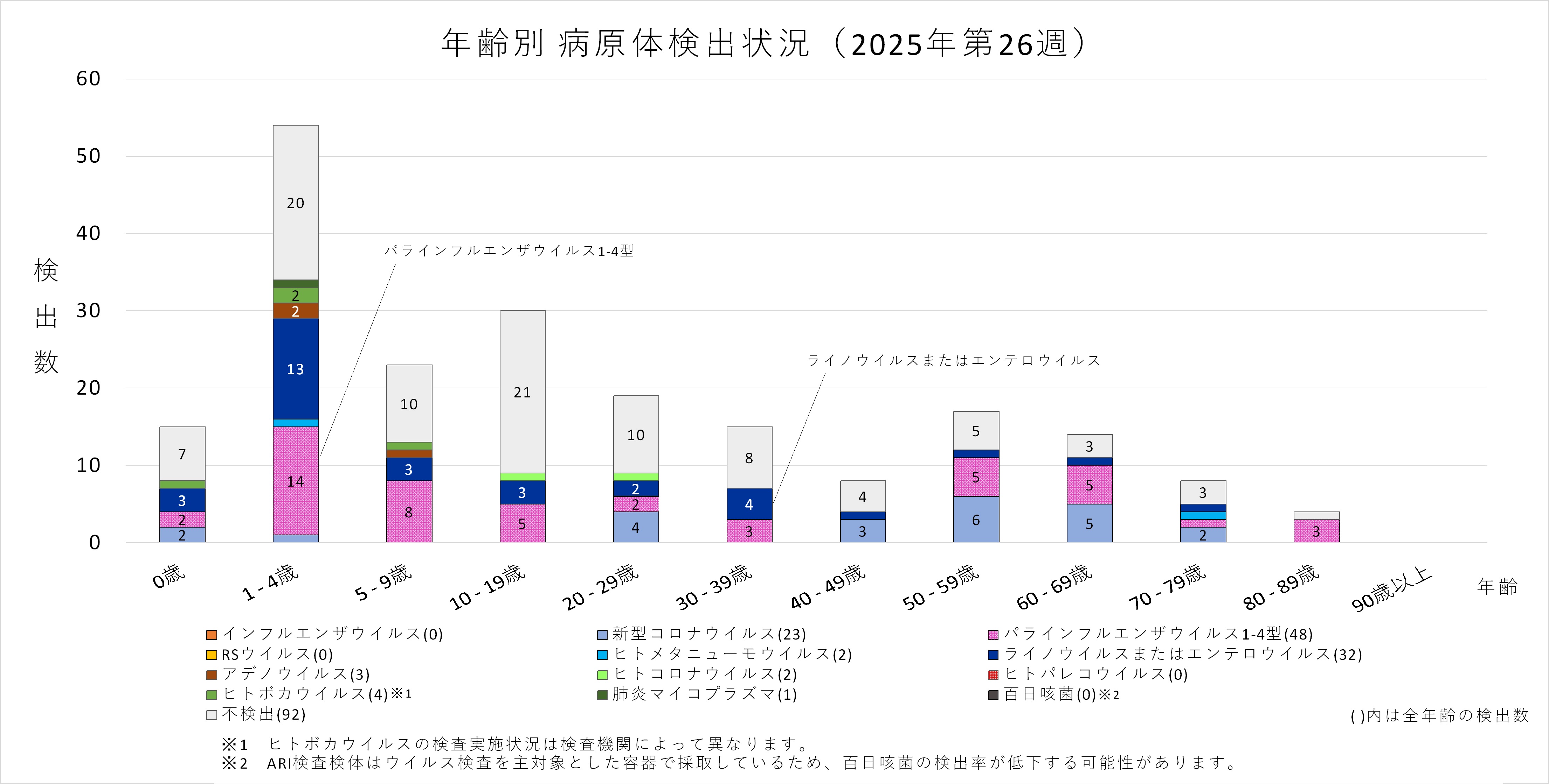 1歳以上5歳未満では引き続きRSウイルス及び「ライノウイルスまたはエンテロウイルス」の検出が目立っています。
