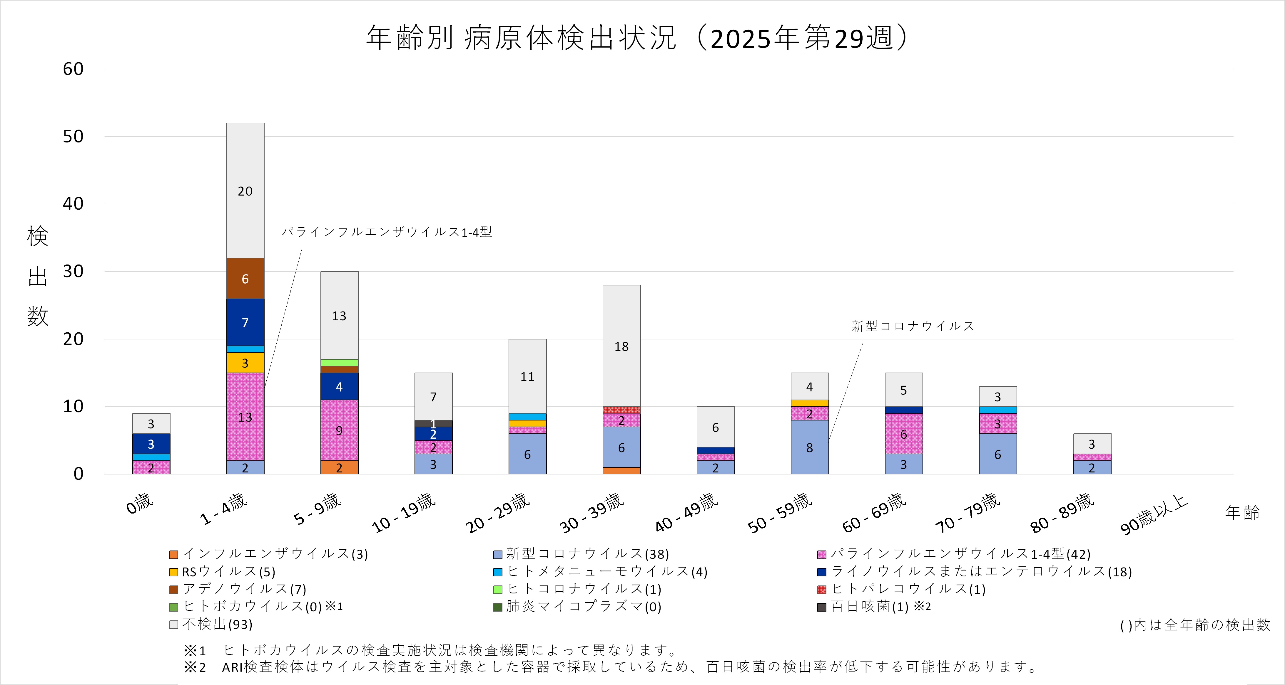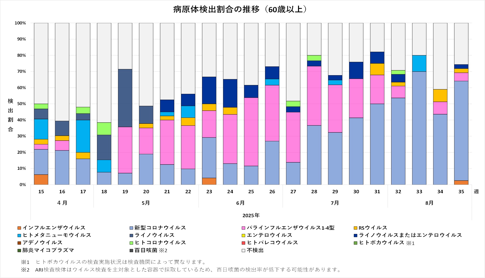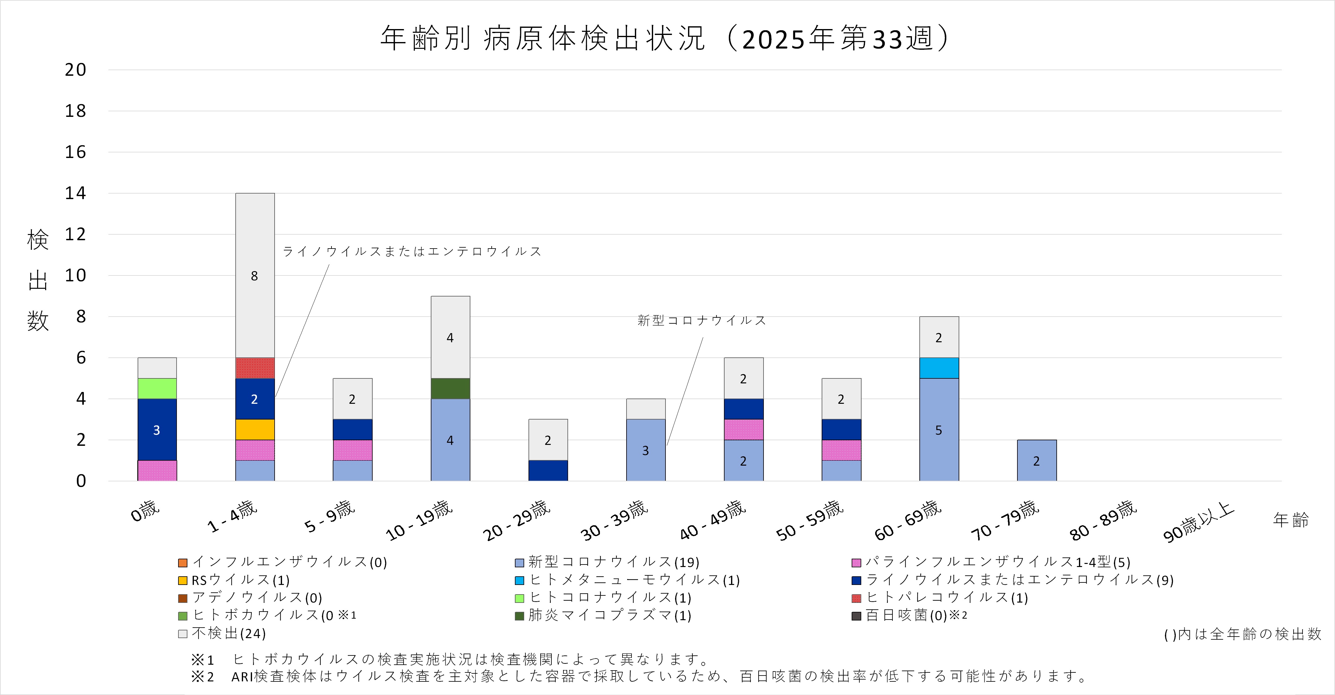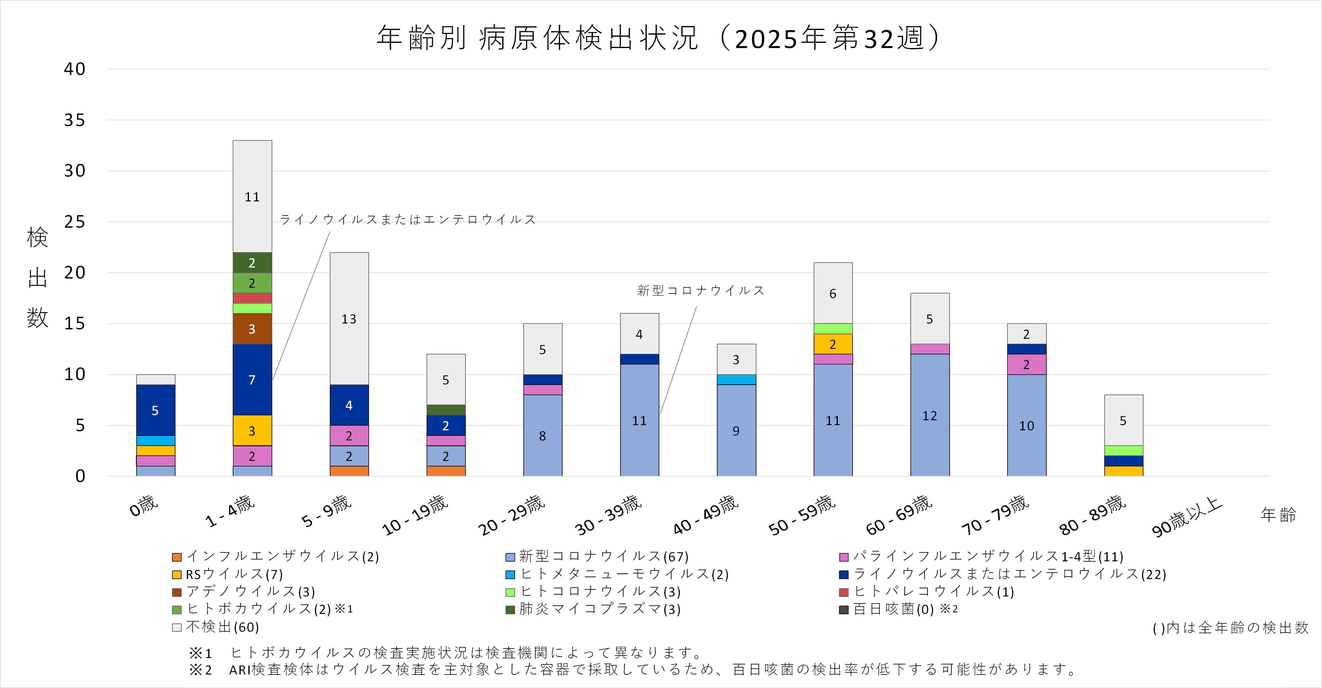 1歳以上5歳未満では引き続きRSウイルス及び「ライノウイルスまたはエンテロウイルス」の検出が目立っています。