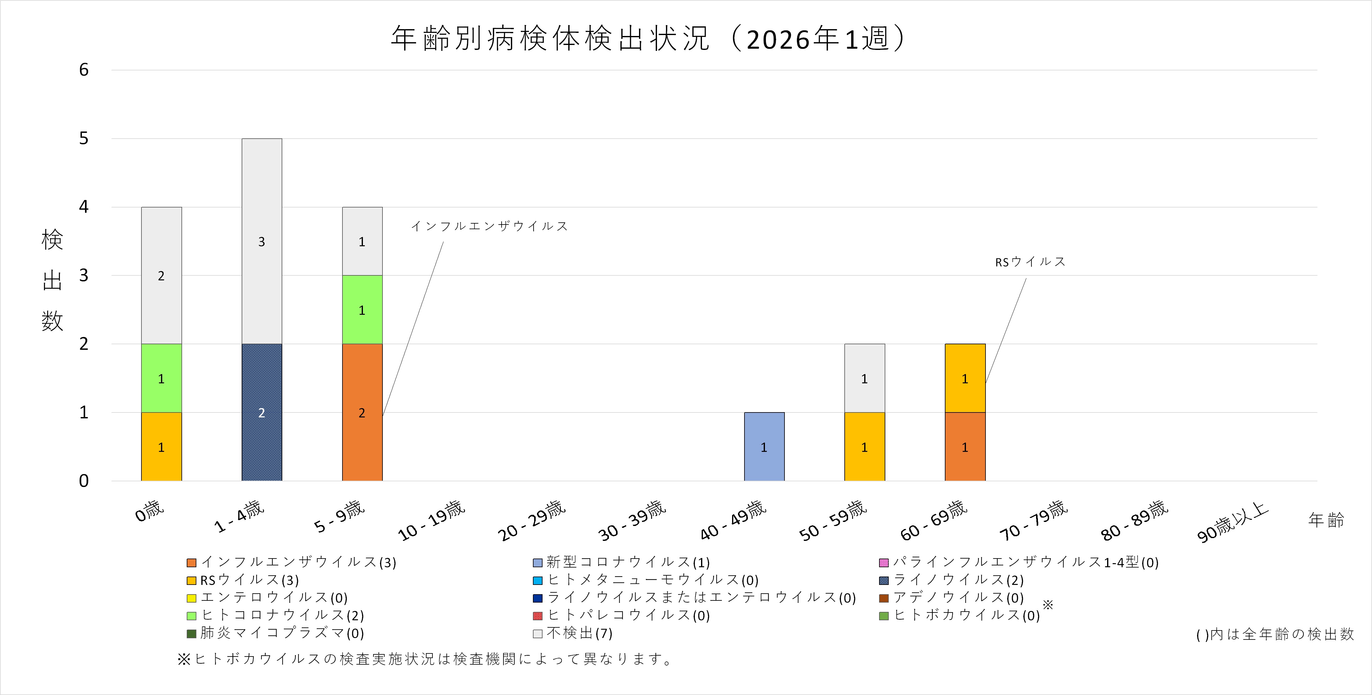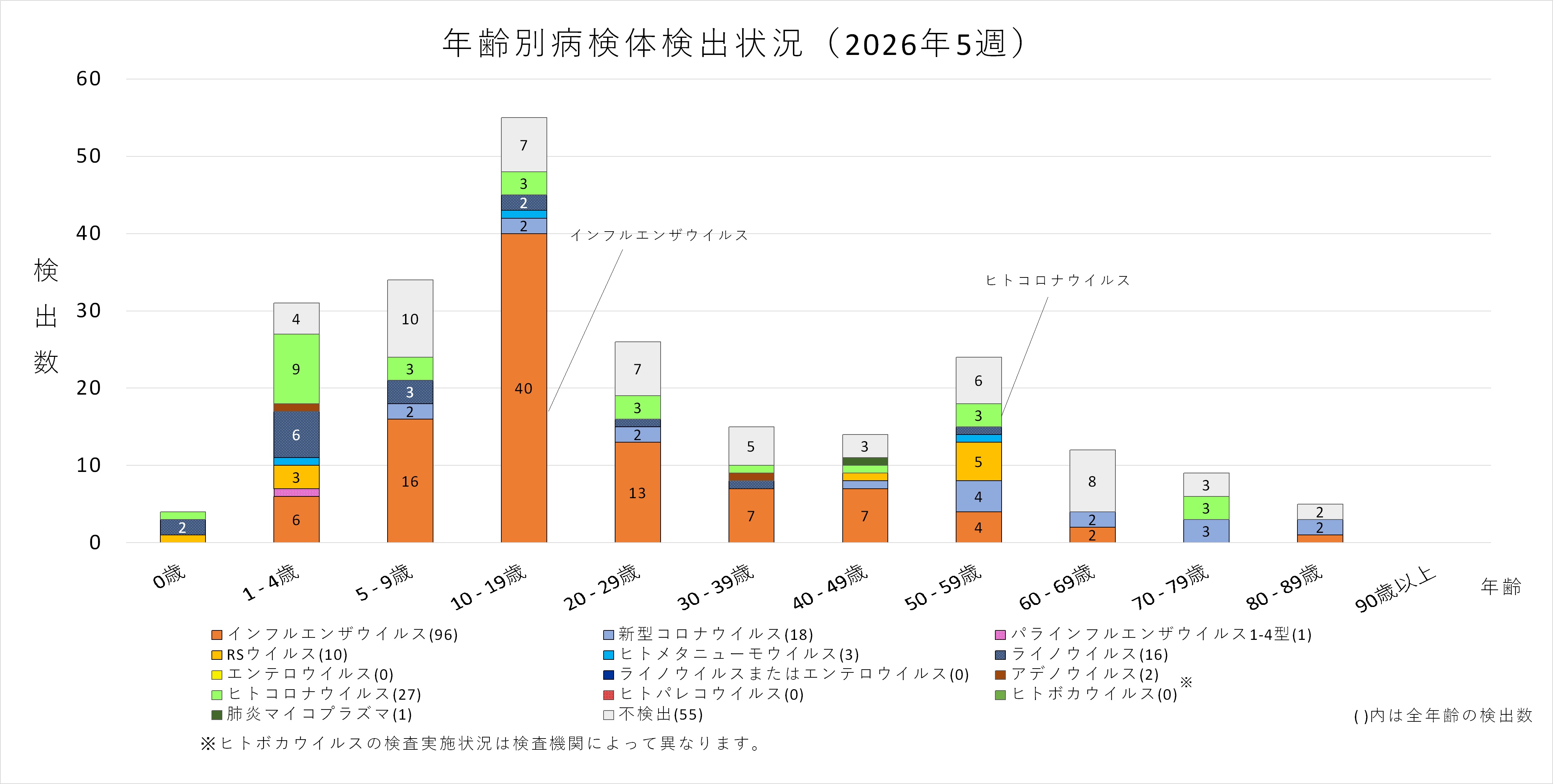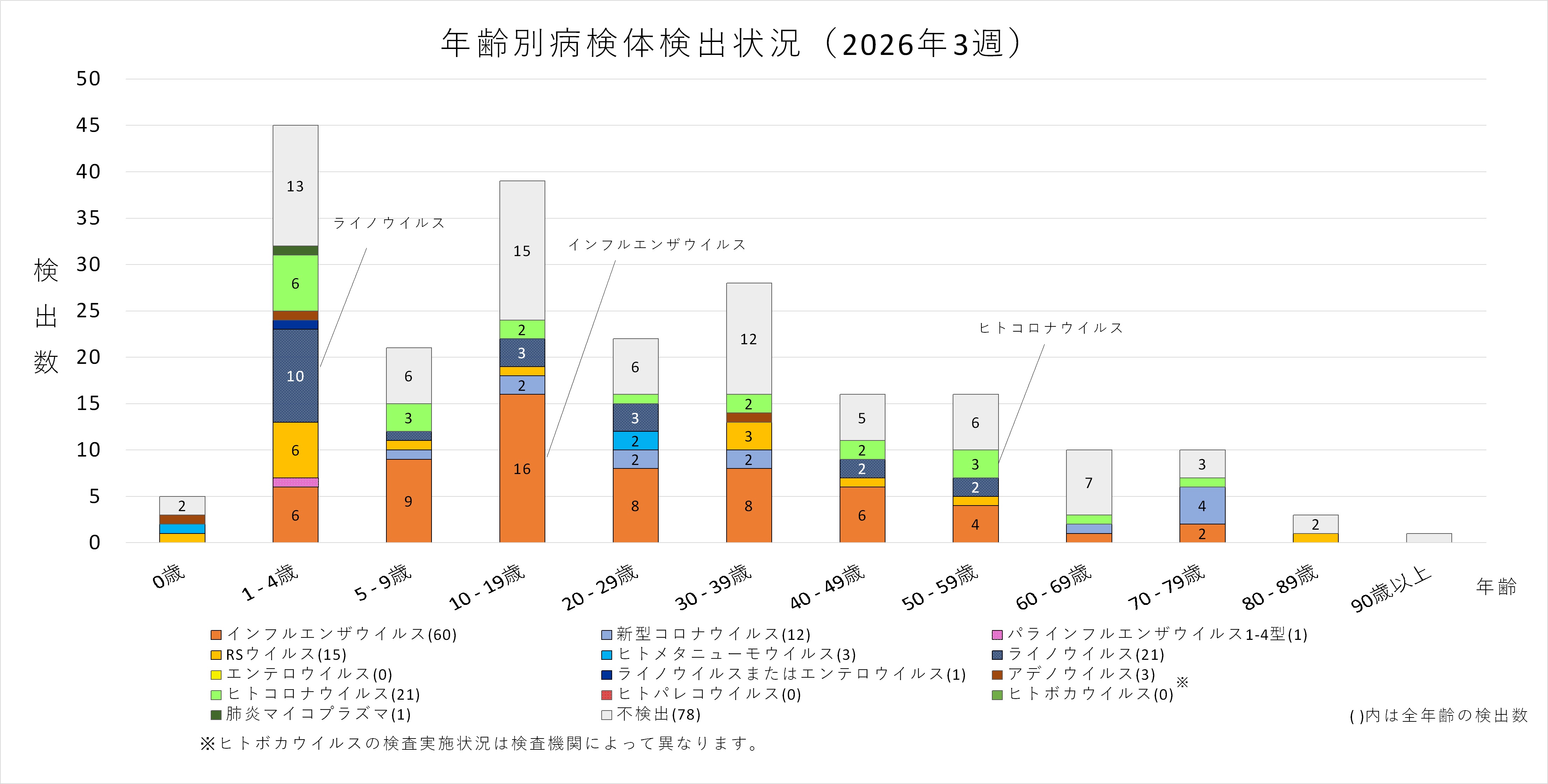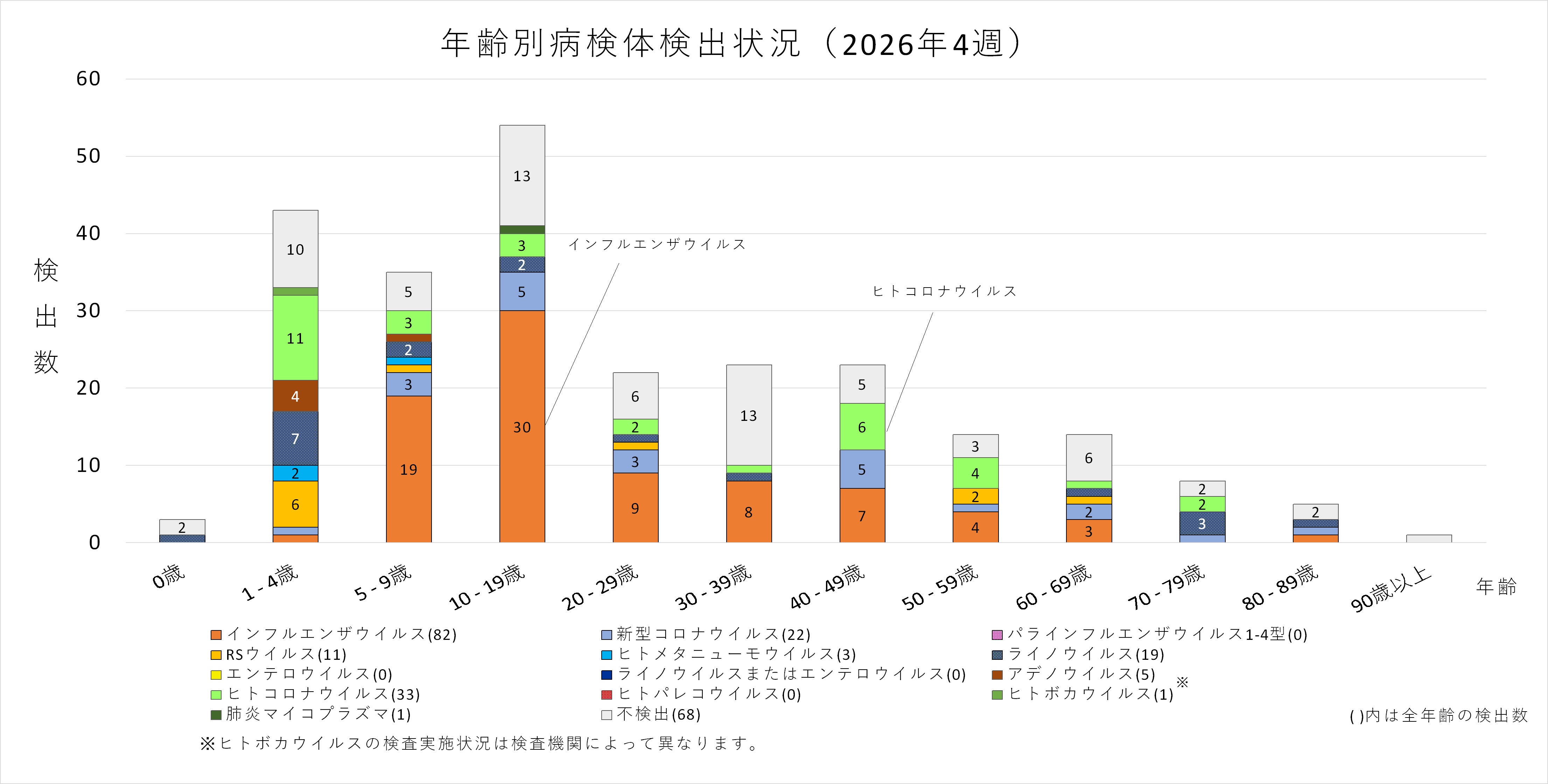 年齢層別にみると、1歳から70歳未満及び90歳以上の幅広い年齢層でインフルエンザウイルスが検出され、5歳から30歳未満では採取された検体の半数以上からインフルエンザウイルスが検出されています。また、ヒトコロナウイルスも多くの年齢層で検出されており、50歳から60歳未満ではインフルエンザと同数のヒトコロナウイルスが検出されています。