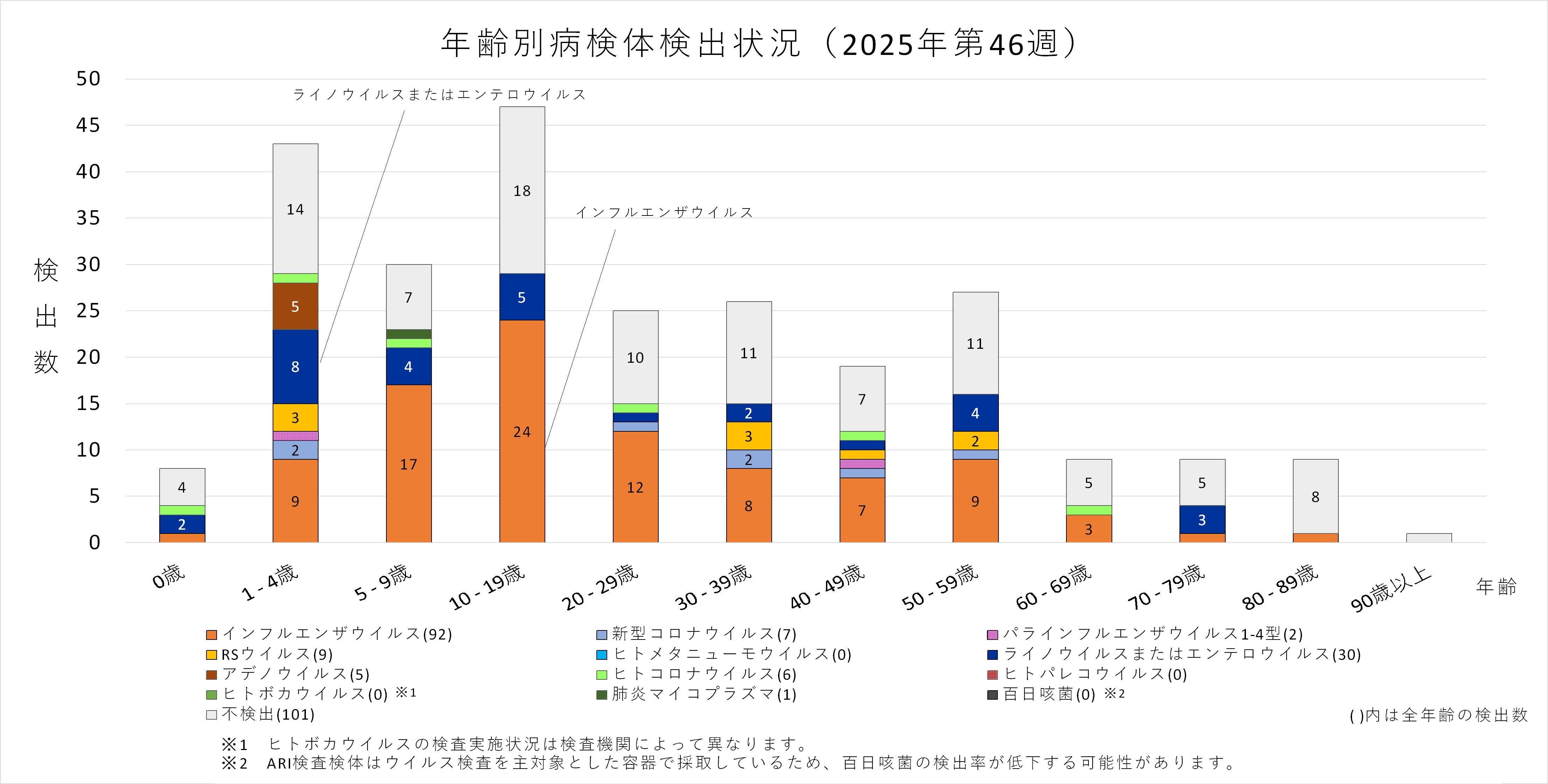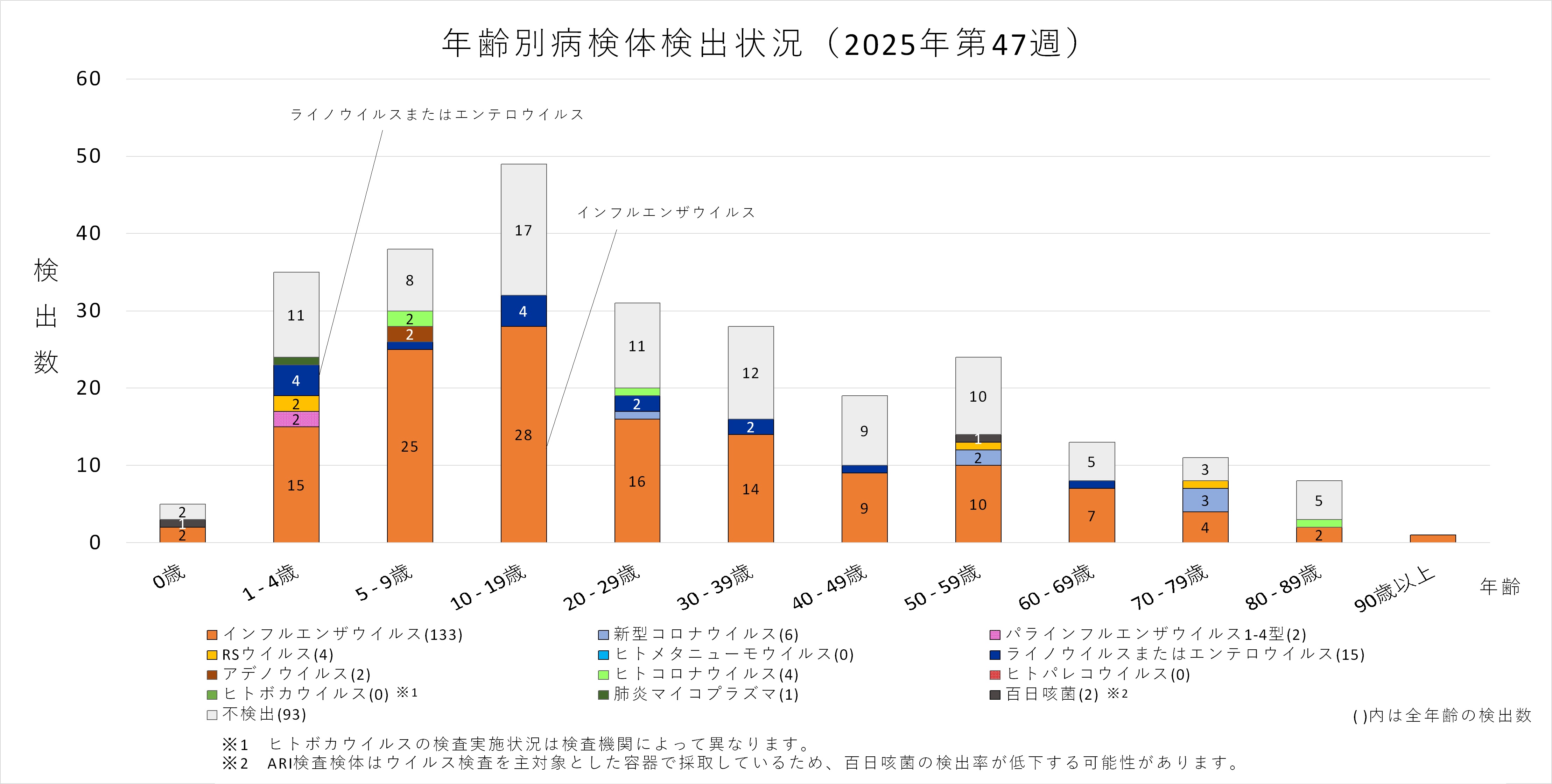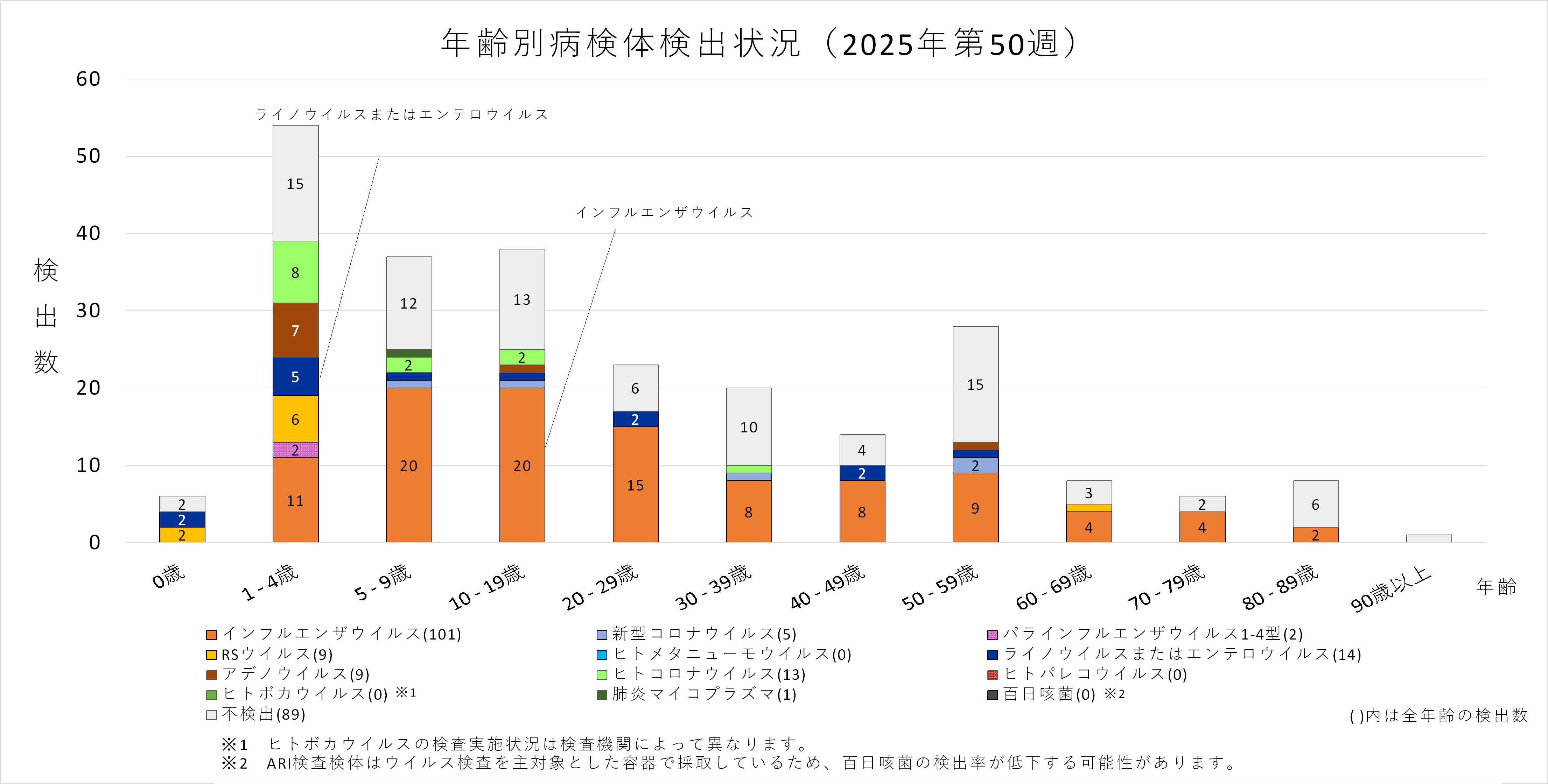 年齢層別にみると、1歳から70歳未満及び90歳以上の幅広い年齢層でインフルエンザウイルスが検出され、5歳から30歳未満では採取された検体の半数以上からインフルエンザウイルスが検出されています。また、ヒトコロナウイルスも多くの年齢層で検出されており、50歳から60歳未満ではインフルエンザと同数のヒトコロナウイルスが検出されています。