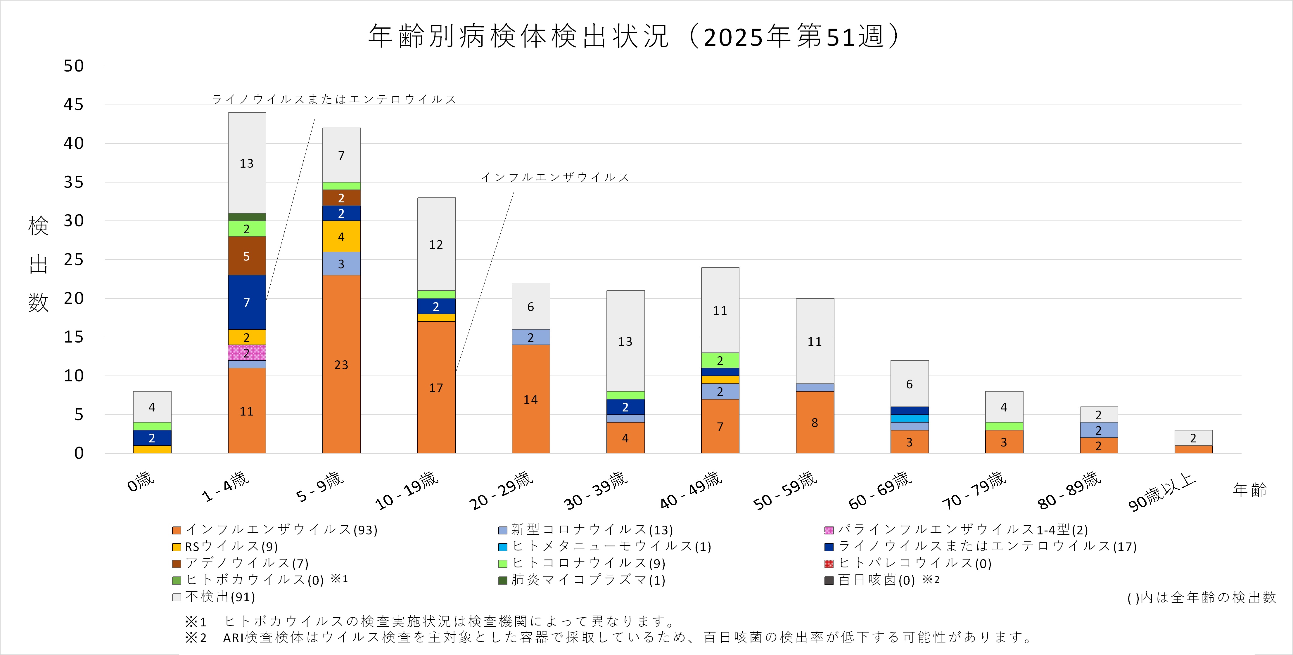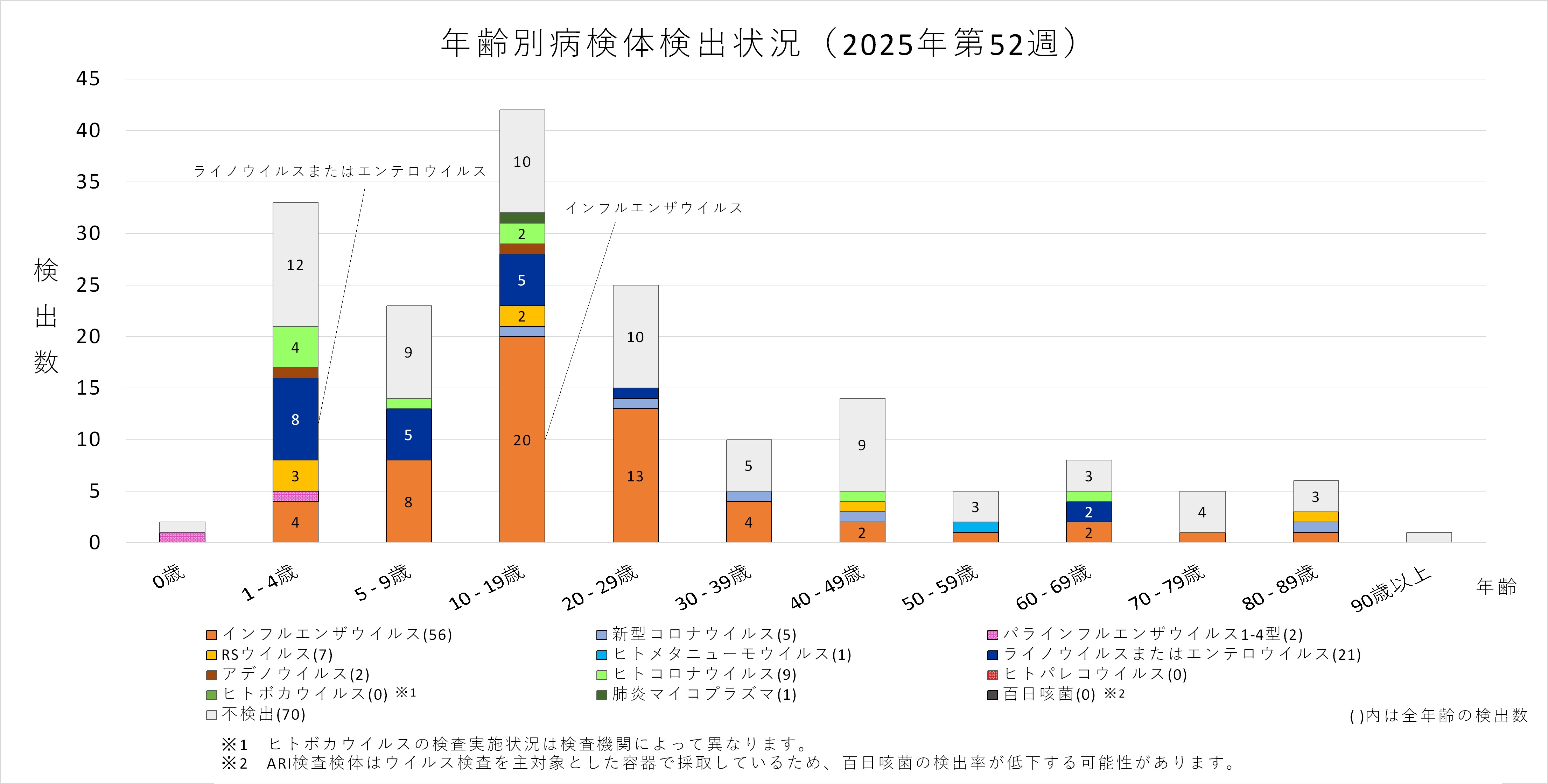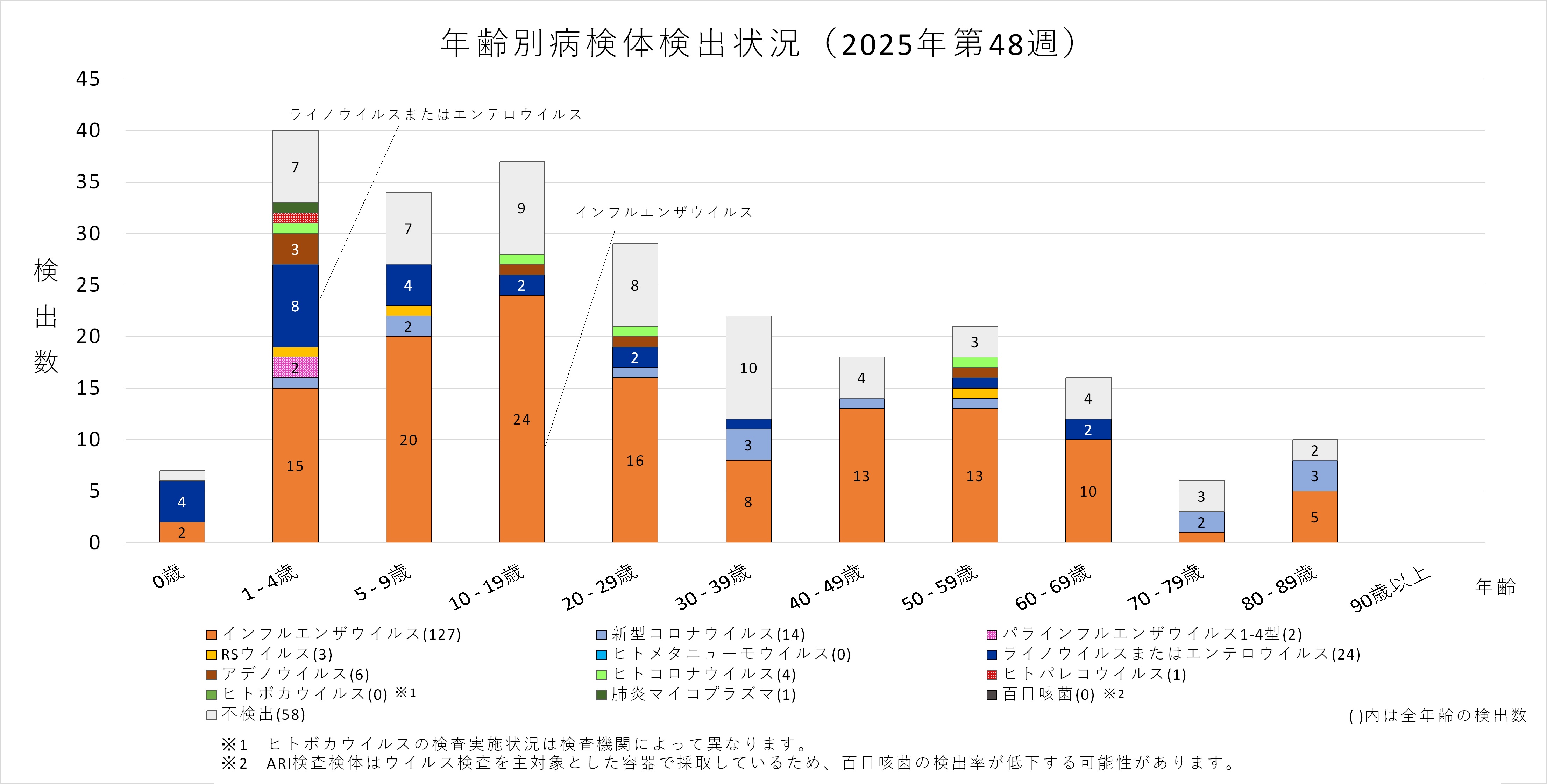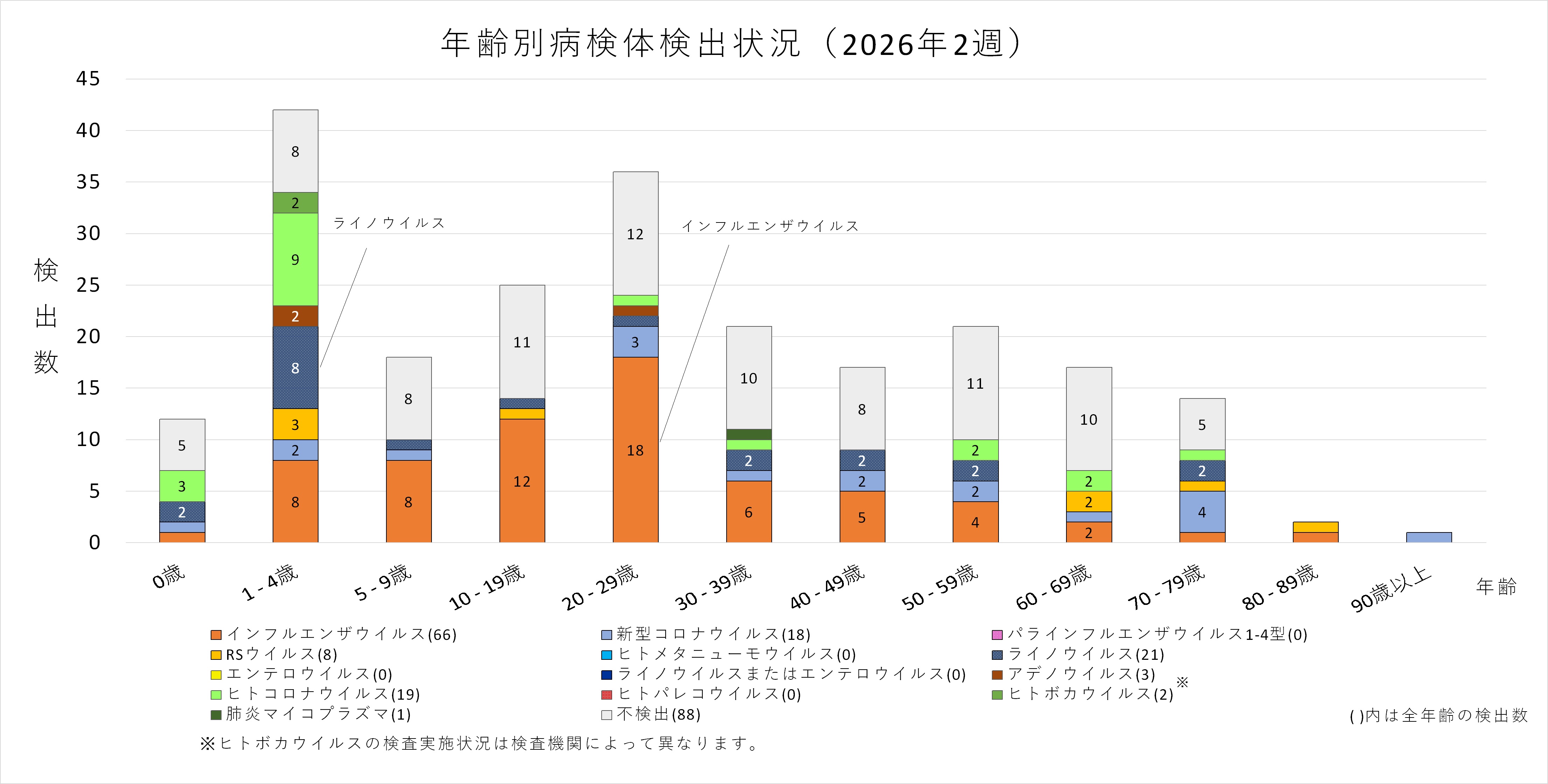 年齢層別にみると、1歳から70歳未満及び90歳以上の幅広い年齢層でインフルエンザウイルスが検出され、5歳から30歳未満では採取された検体の半数以上からインフルエンザウイルスが検出されています。また、ヒトコロナウイルスも多くの年齢層で検出されており、50歳から60歳未満ではインフルエンザと同数のヒトコロナウイルスが検出されています。