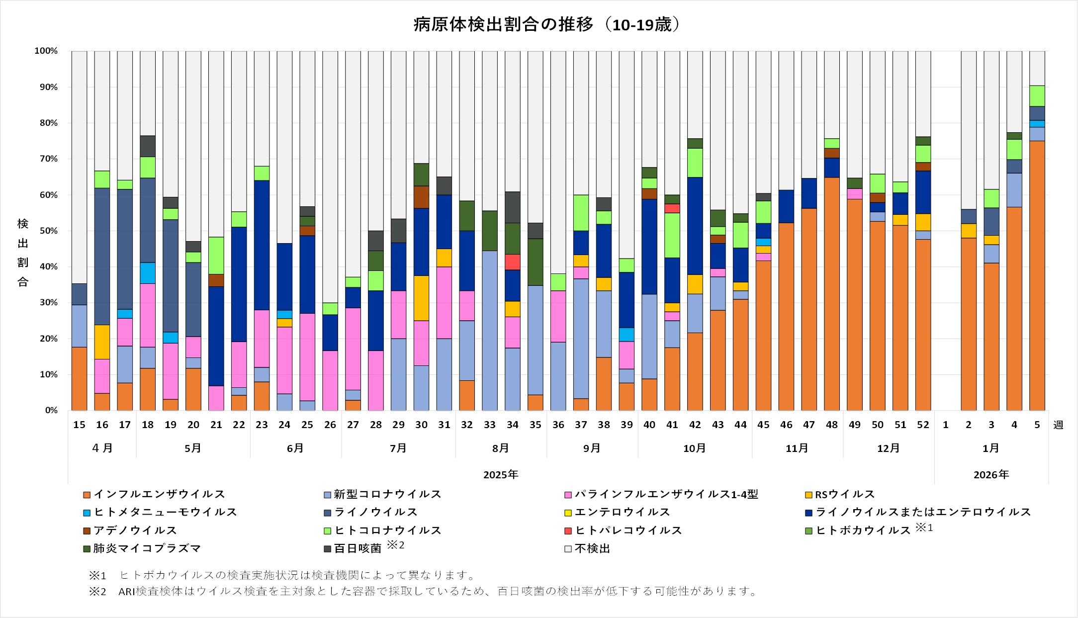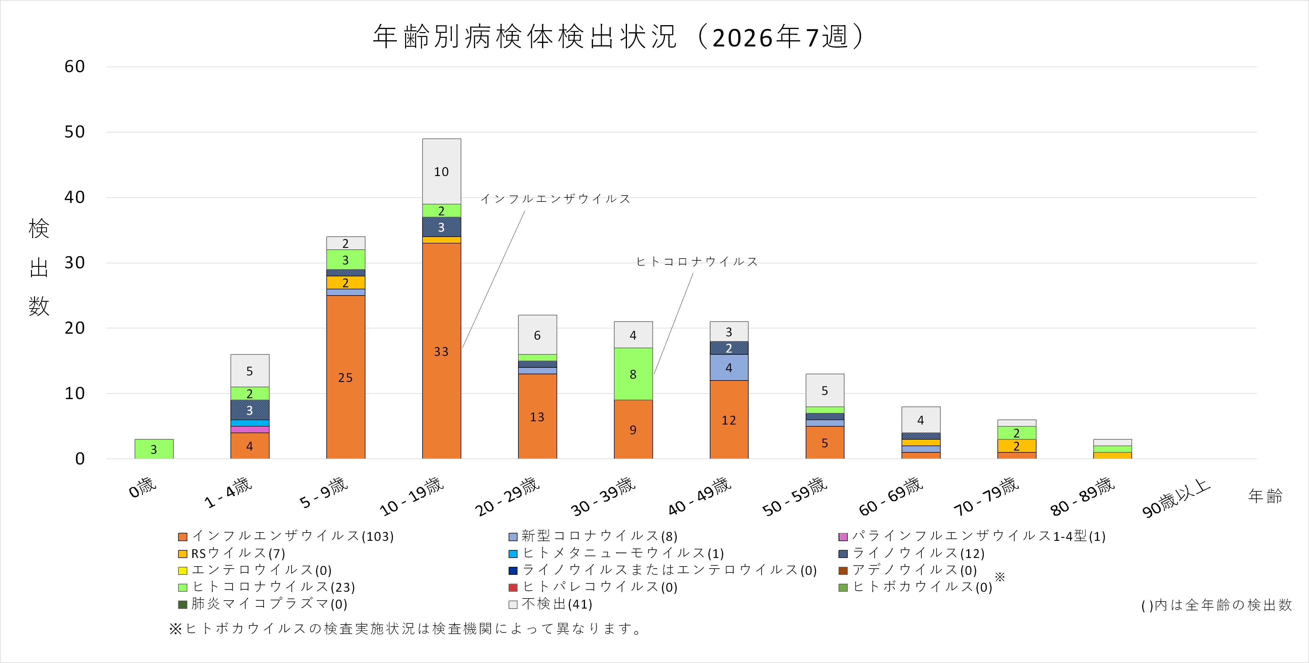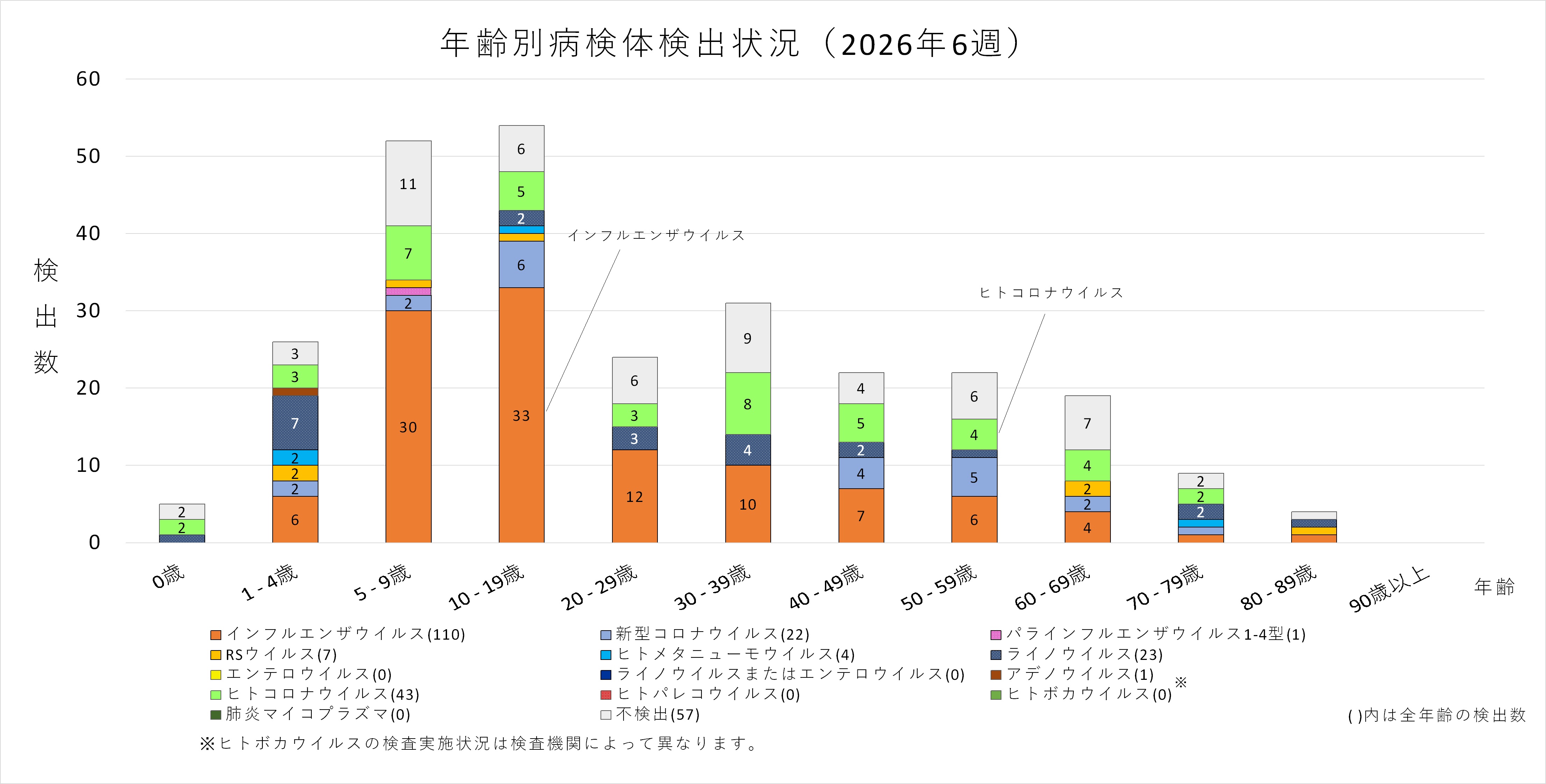 感染症の予防及び感染症の患者に対する医療に関する法律第14条の2に基づく感染症発生動向調査により、2025年4月7日(第15週)以降、埼玉県内の定点医療機関で採取に御協力いただいた検体について、埼玉県衛生研究所、さいたま市健康科学研究センター、川越市保健所、越谷市保健所及び川口市保健所でおこなった検査結果を集計しています。2026年3月9日時点の集計であるため、今後データが更新される可能性があります。