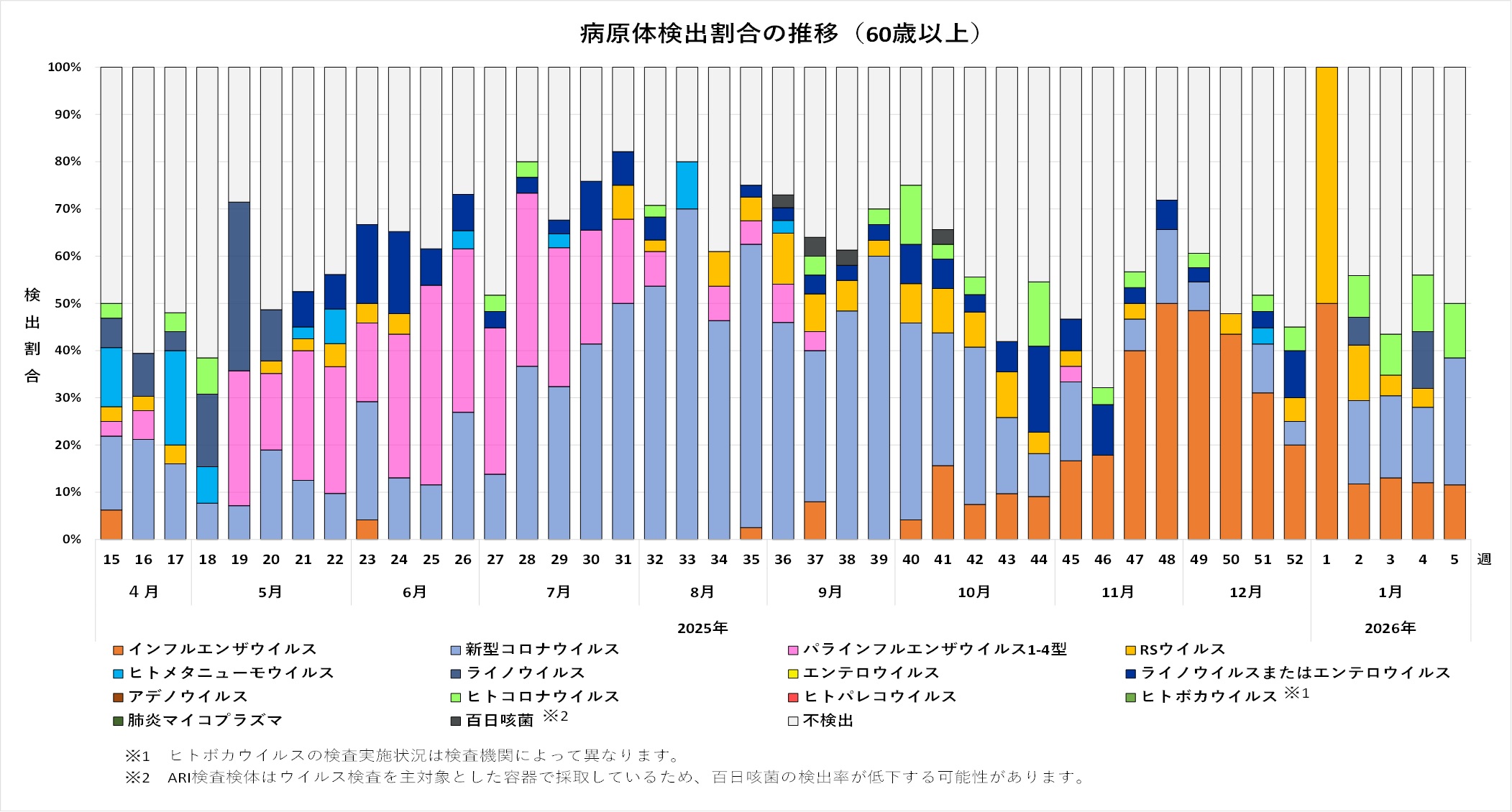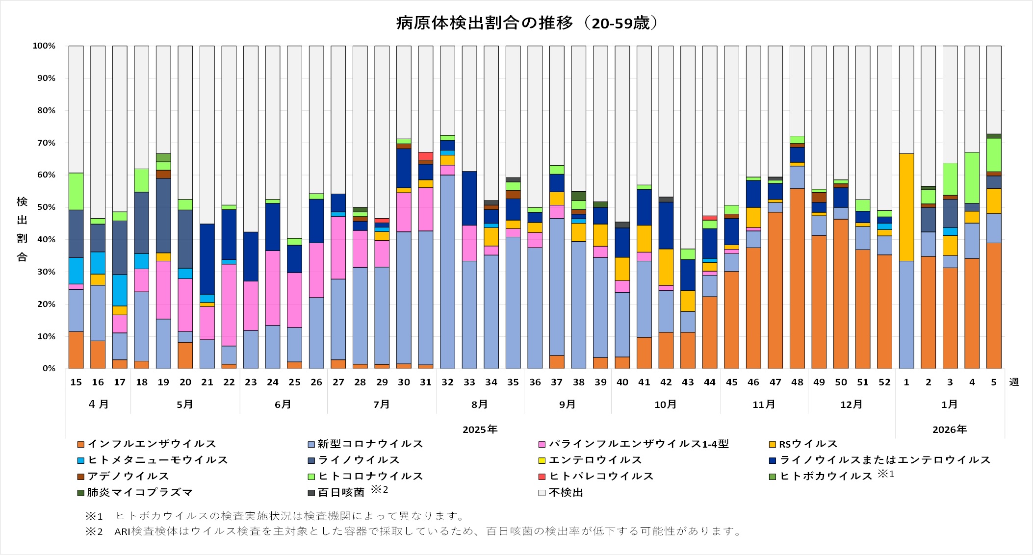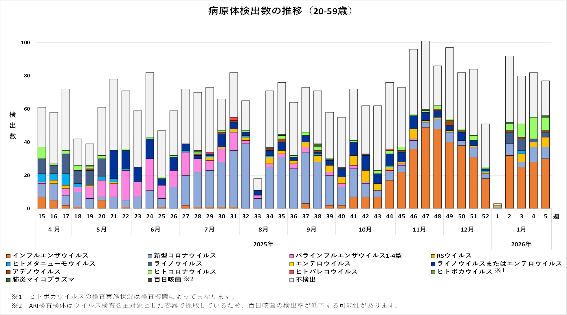 感染症の予防及び感染症の患者に対する医療に関する法律第14条の2に基づく感染症発生動向調査により、2025年4月7日(第15週)以降、埼玉県内の定点医療機関で採取に御協力いただいた検体について、埼玉県衛生研究所、さいたま市健康科学研究センター、川越市保健所、越谷市保健所及び川口市保健所でおこなった検査結果を集計しています。2026年3月9日時点の集計であるため、今後データが更新される可能性があります。