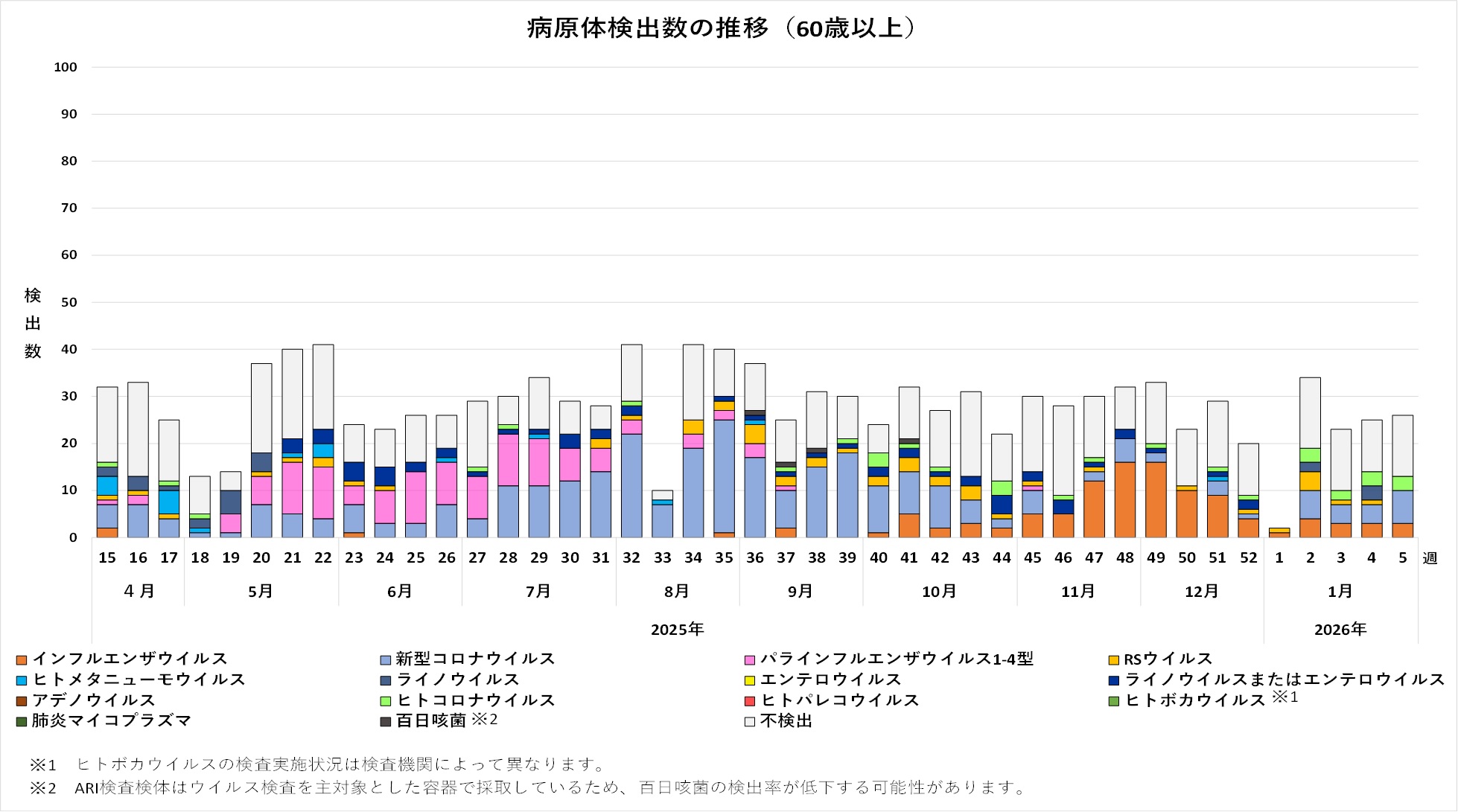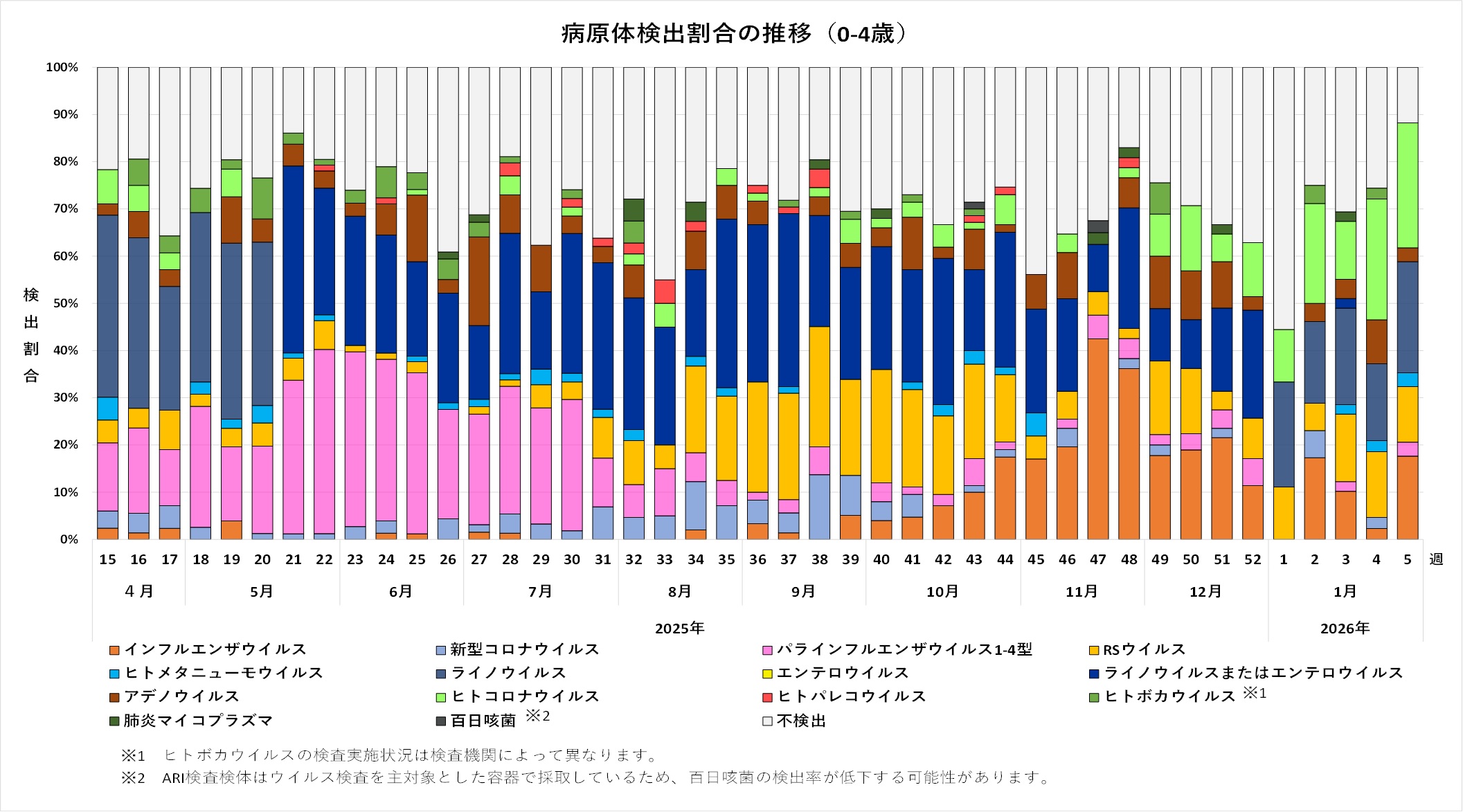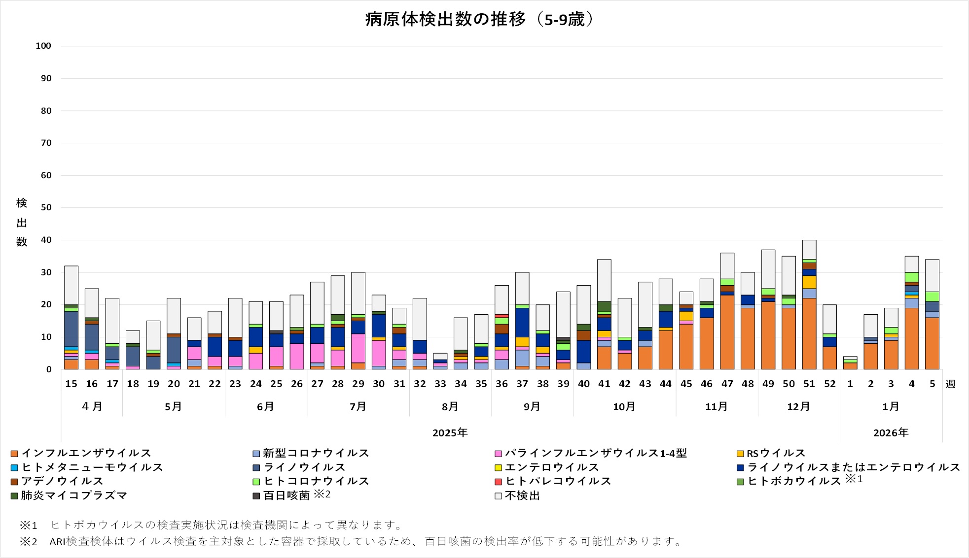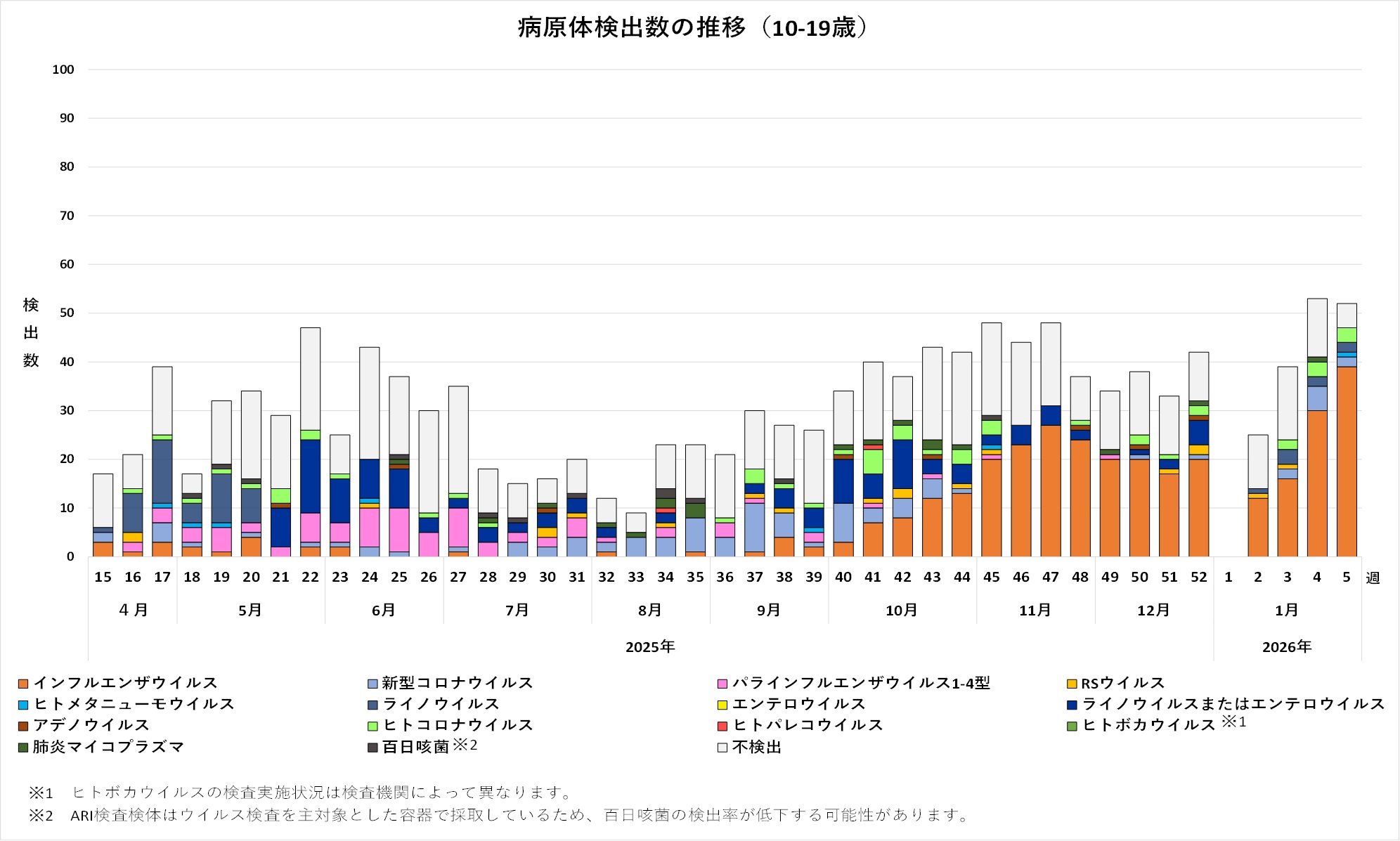 2025年18週から52週までに採取され、対象ウイルスが不検出であった一部検体について、百日咳菌の検査を実施しました。