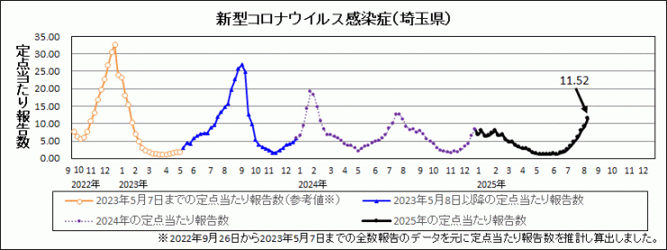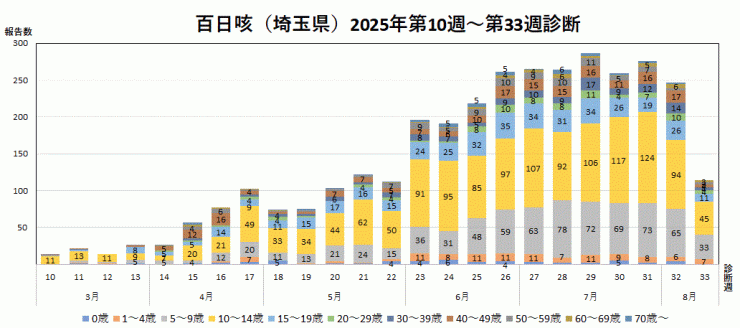 2025年第33週(8月11日~8月17日)は、百日咳は多い状況が続いており、新型コロナウイルス感染症は増加傾向にあります。