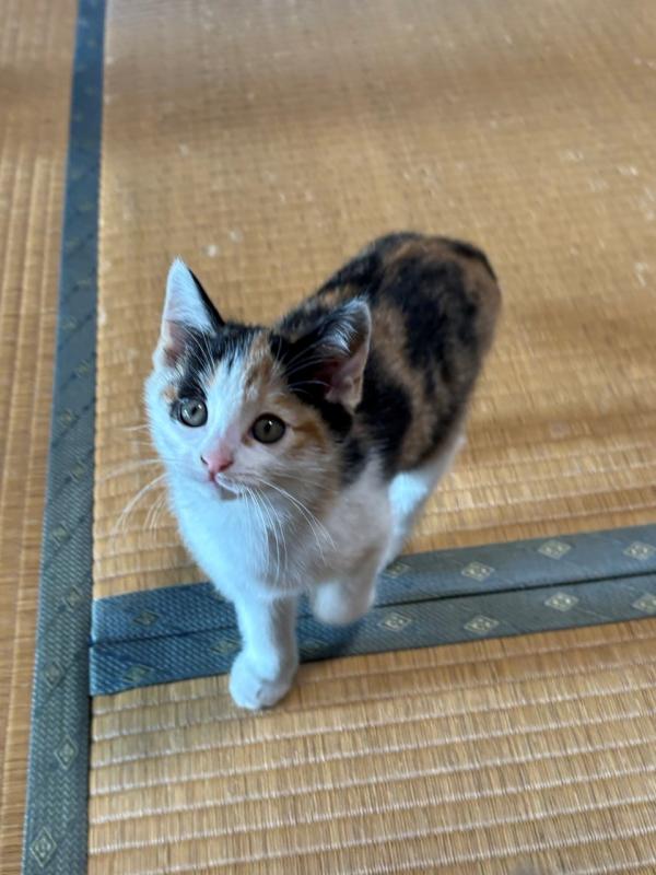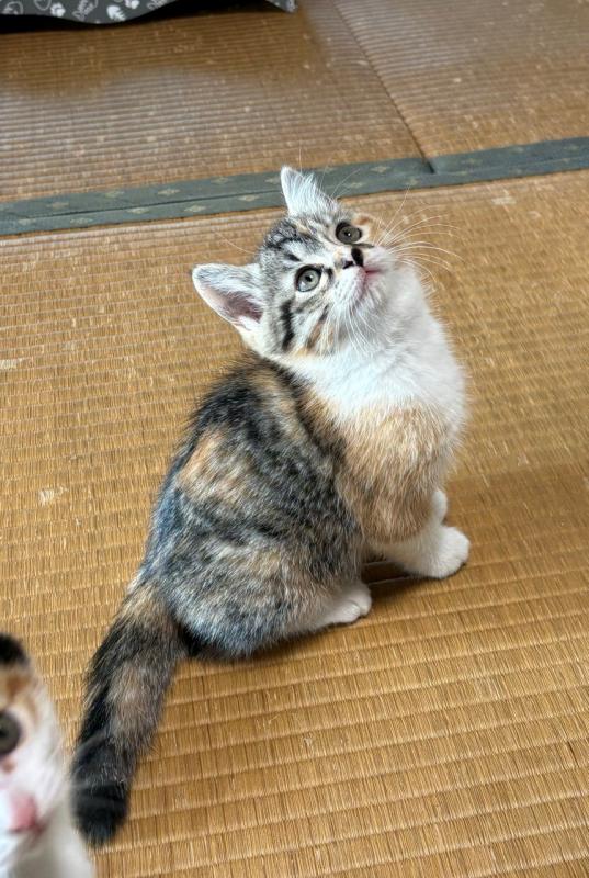 母猫が室内で出産し、完全室内飼育で大切に育ててきました。人に良く慣れていますが、元 とにかく遊ぶのが大好き!5匹の中で、特におもちゃへの情熱が強い女の子です。とても人なつっこく、人が座っていると自分から「遊んで!」と膝の上に乗ってくる積極的な面も。 しま三毛の子(2025-11-002)と特に仲良しです。 体重約910g(11月16日時点)。食欲旺盛で、ウェットもドライも上手に食べられます。健康状態は良好で、システムトイレも完璧です。 ワクチン・ウイルス検査は未実施です。譲渡時(またはトライアル前)にご相談の上で実施し、実費(10,000~15,000円程度)のご負担をお願いいたします。 終生、家族の一員として愛情をたっぷり注ぎ、完全室内飼育と脱走防止対策をしていただけ |