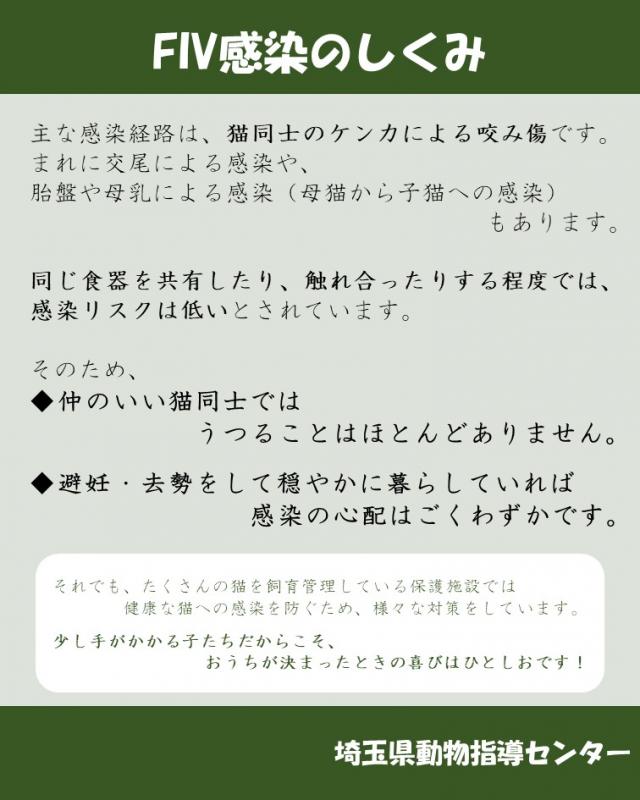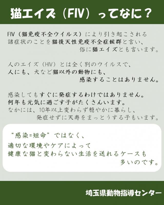 ※FIV(猫免疫不全ウイルス)により引き起こされる諸症状のことを猫後天性免疫不全症候群と言い、俗に猫エイズとも言います。
