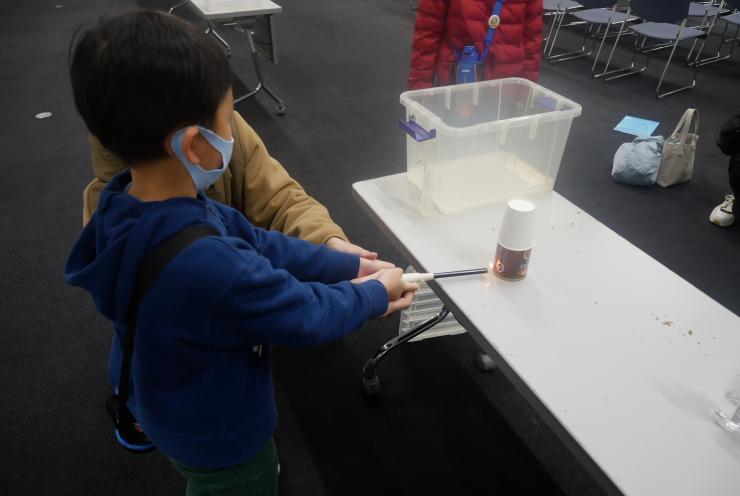 C サイエンスショー「どっか~ん!-ものが燃え爆発するしくみをさぐる」 子どもから大人まで楽しめる人気の実験ショー! 今回はものが燃えるのはどうしてか、激しく燃えて爆発するのはどういう時かを、さまざまな実験を通してさぐっていきます。 講師:清水龍郎 先生