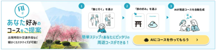 AIが県内の観光スポットを組み合わせたコースを御提案します。出発時刻や交通手段などのカスタマイズが可能です。