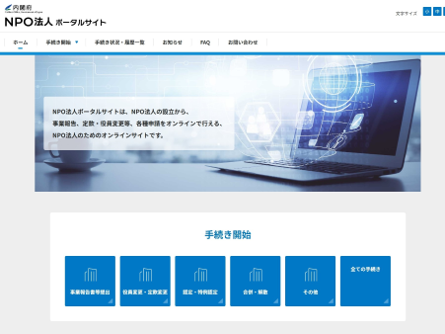 内閣府 NPO法人ポータルサイト内「ウェブ報告システム」を通じて、NPO法人に関する申請・届出等をインターネットにより手続きが行えます。