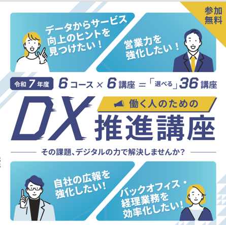 県内中小企業の従業員向けに、デジタルスキルを磨く「DX推進講座」をオンラインで実施しています。6コース全36講座を全て無料で受講できます。申込方法や講座内容などの情報は特設HPでご確認ください。