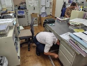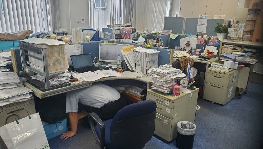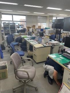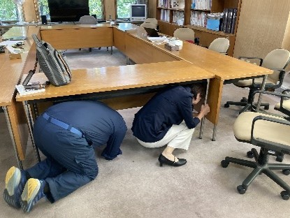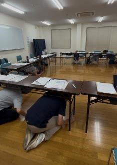 【コメント】 「地震が発生した際には家具の転倒や書類の散乱も想定される。訓練を通じて、日頃から家具が固定されているかの確認や室内の物品の整理も重要だと感じた」、と参加者から意見を頂きました。常日頃から有事に備えておくことが重要です。 |