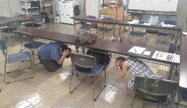 【コメント】 200名程度の生徒がいる同専門学校で、一斉に訓練を校長がリーダーとなって体験。具体的ケースを想定し、身をかがめる、頭を机下に隠すことをしました。時間的に、関東大震災の発生同時刻に合わせ体験していただきましたが、スムーズに実施できました。 |