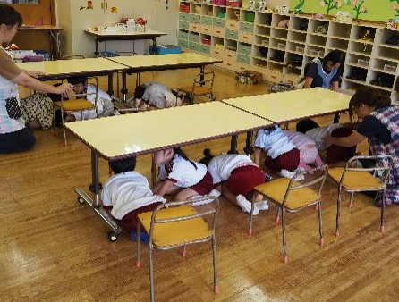 【コメント】 「まず低く、頭を守る、動かない」は、毎年の防災避難訓練のなかで基本動作として取り入れていたが、今回はじめて「シェイクアウト訓練」として実施した。子どもたちに避難場所や経路を日頃からなじませておく必要性などの気づきを得ることができた、とのコメントを園長から頂きました。 |