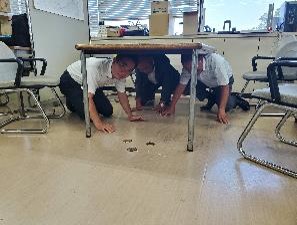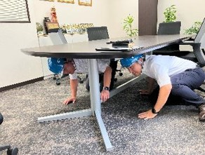 【コメント】 テーブルでの打ち合わせ時に地震が発生して、テーブルの下に隠れ、改めて避難場所について確認しました。非日常的な行動のため、慣れない方は少し手間取ったようでしたが、一度でも経験しておくことでいざという時の備えになると実感できました。 |
