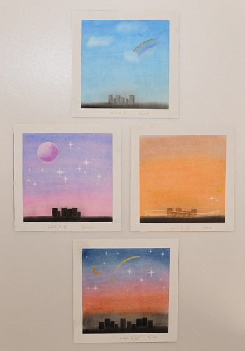 作品は全てパステルで描いている。綺麗なグラデーションは手やパフなどを使い、白く輝くキラキラした部分は消しゴムや練り消しなどを用いて足し算だけでなく引き算的な技法も駆使しているという。特に月、ビル、星などの型取りを大切にして描くことがパステル作品において大切なコツであると語ってくれた。