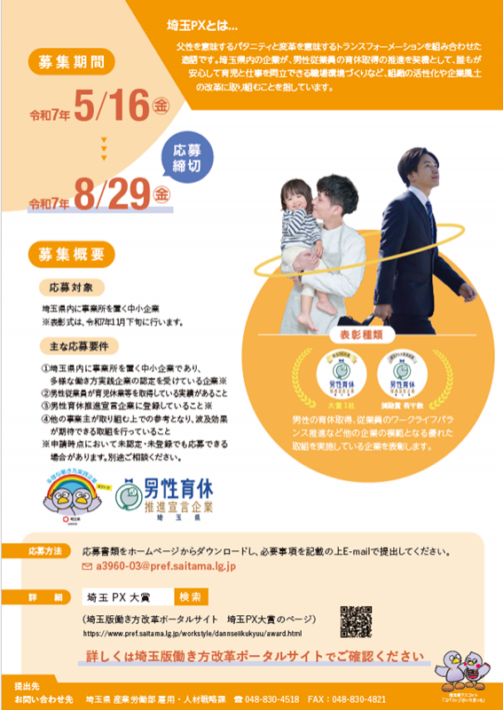 埼玉県では、男性の育児休業取得を後押しするため、男性の育児と仕事の両立を積極的に支援する県内中小企業を「埼玉PX大賞」として表彰しています。